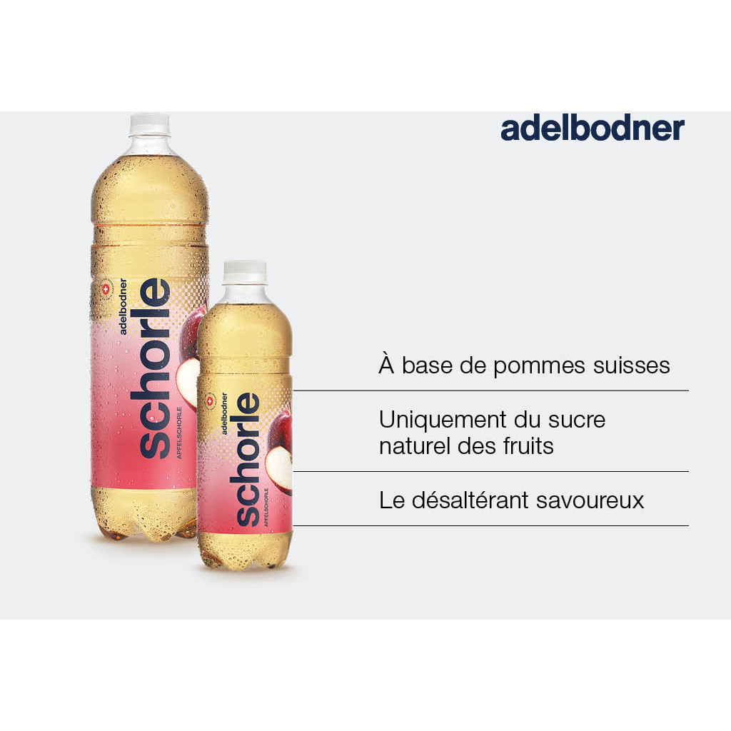 Adelbodner Apfelschorle, la boisson désaltérante savoureuse avec tout l'arôme des pommes suisses ! Là où il y a écrit Suisse, il y a aussi de la Suisse dedans.