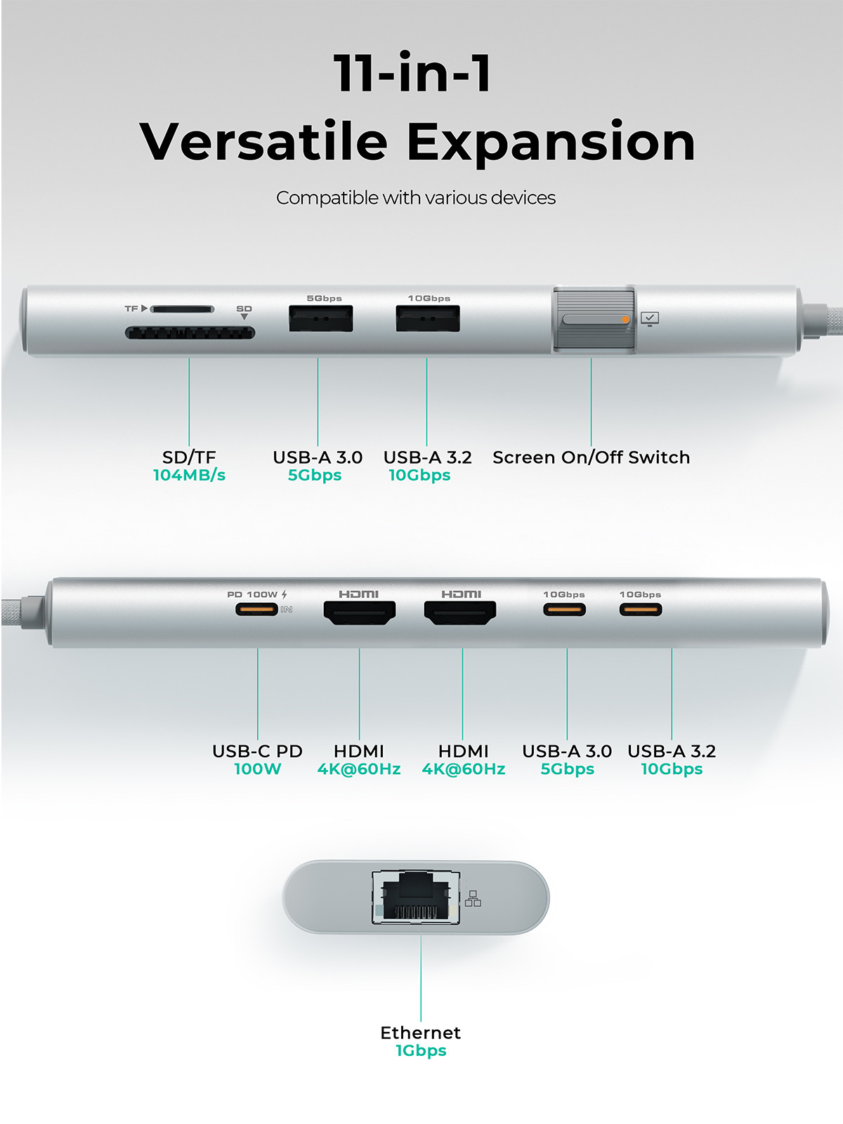 4K@60HzVidéo : Conçu pour une transmission rapide et stable du signal, ce hub permet de lire vos contenus 4K avec une fluidité de 60 Hz, garantissant ainsi une expérience visuelle impressionnante.