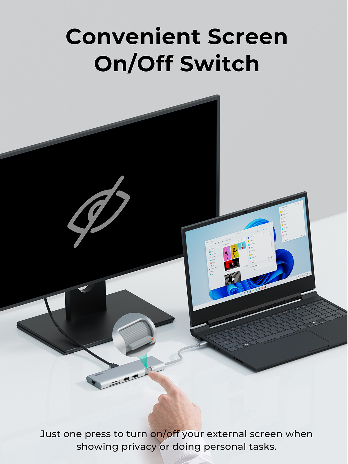- Bouton d'extinction pratique : le hub dispose d'un bouton d'extinction qui vous permet d'éteindre instantanément votre écran miroir/étendu afin de protéger votre vie privée lors des réunions.