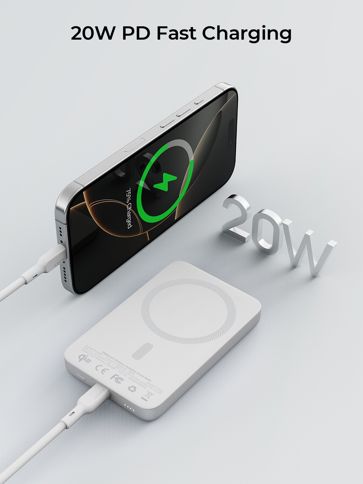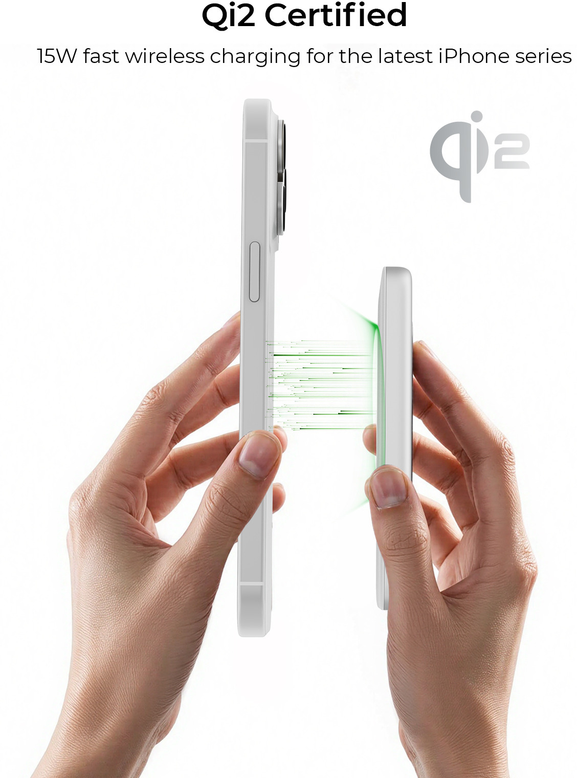 Le powerbank est plus fin et plus léger et se glisse parfaitement dans votre poche, votre porte-monnaie et votre sac à main, c'est donc un excellent compagnon de charge que vous pouvez emporter partout avec vous. Le boîtier métallique du powerbank est extrêmement résistant aux chutes, à l'usure, à la saleté et aux températures élevées, ce qui lui confère une durabilité et une protection exceptionnelles. Le boîtier métallique permet également à la chaleur de se dissiper facilement, ce qui garantit un fonctionnement interne stable. Certifié Qi2, il est compatible avec vos appareils compatibles Qi2 et offre une expérience de charge plus rapide et plus sûre. Ce powerbank vous offre deux méthodes alternatives flexibles pour une recharge rapide 20W wired &15W Wireless. Qu'ils soient câblés ou sans fil, vos appareils restent toujours alimentés. Assurez-vous que votre téléphone reste attaché et connecté à la banque de puissance tout le temps.