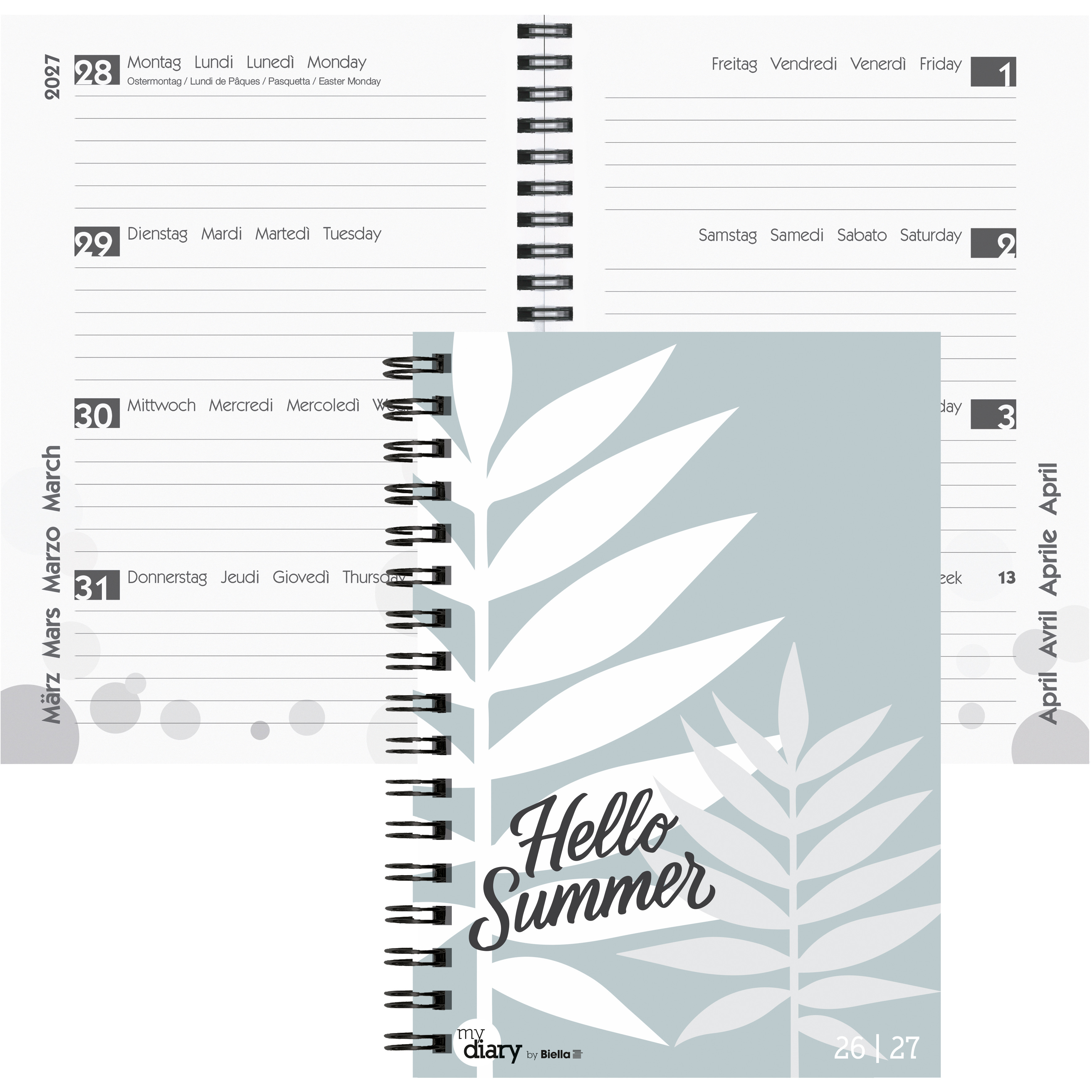 L'agenda scolaire Biella brille par son aspect tendance, son calendrier moderne et ses nombreuses fonctions supplémentaires. Il convient parfaitement comme agenda classique, cahier de devoirs, journal intime ou combinaison de tout cela. La version 1 semaine sur deux pages avec reliure à spirale offre suffisamment de place pour les rendez-vous scolaires et privés et vous donne un aperçu de la semaine. Format 14,5 x 20,5 cm (A5). 178 pages, 3½ jours par page. Couverture en papier Cylar (PP translucide) imprimé. Calendrier août - juillet, d-f-i-gb, impression anthracite. Pages annuelles et mensuelles. Perforations dans les coins, grand espace pour les notes. Partie informative, vacances scolaires Suisse, France, Autriche, Allemagne.