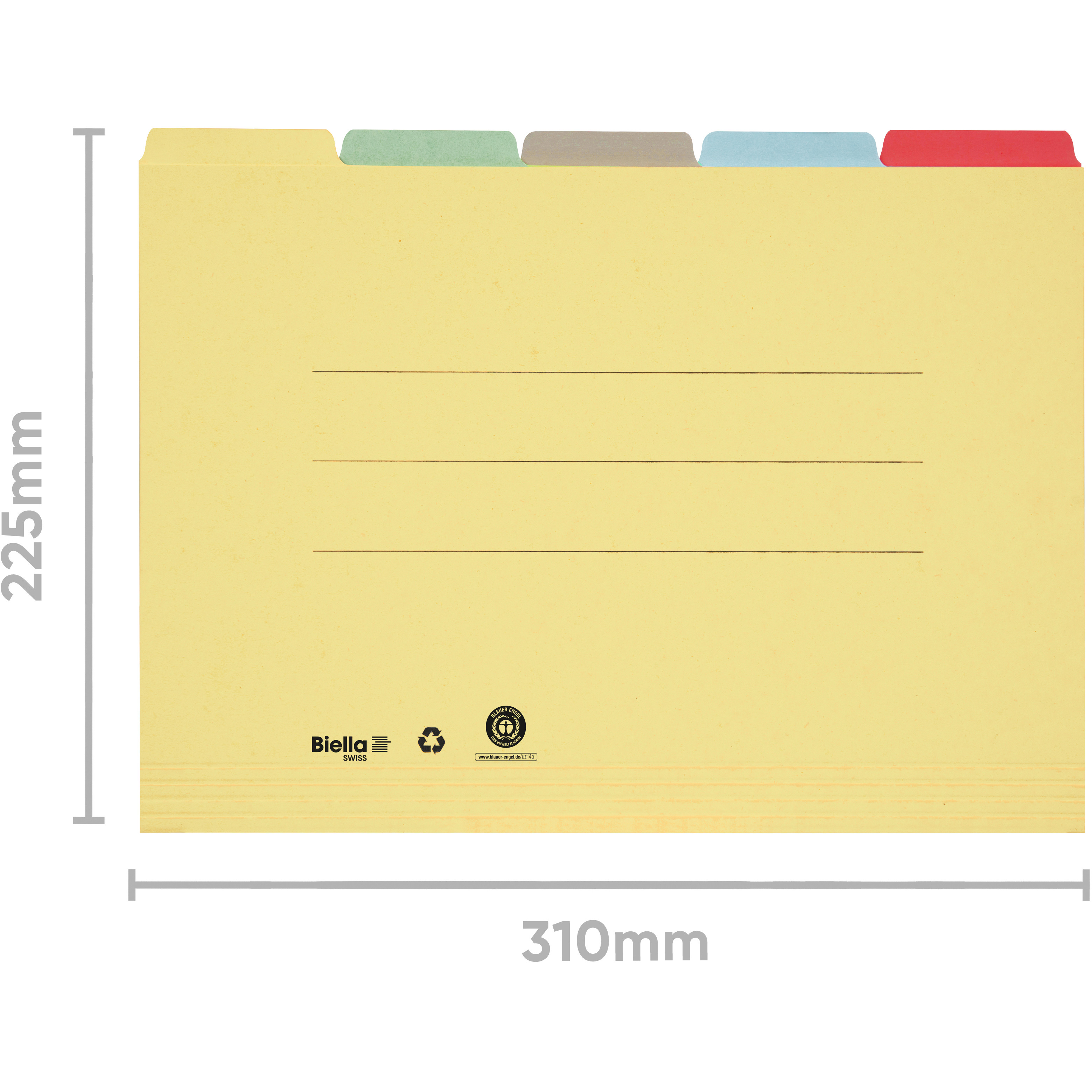 Le dossier de registre pratique en 5 parties de BIELLA garantit une organisation optimale au sein d'un dossier suspendu ORIGINAL®. Avec ses 5 chemises de couleurs différentes et équipées d'onglets d'index décalés, vous pouvez retrouver vos documents avec une seule poignée. Les dossiers individuels sont parfaitement adaptés en tant que dossiers de sous-projets, peuvent être utilisés de manière universelle et créent de l'ordre et de la clarté. La couverture avant découpée simplifie le retrait des documents. Les dossiers sont équipés de 3 lignes d'étiquetage et de 5 rainures.