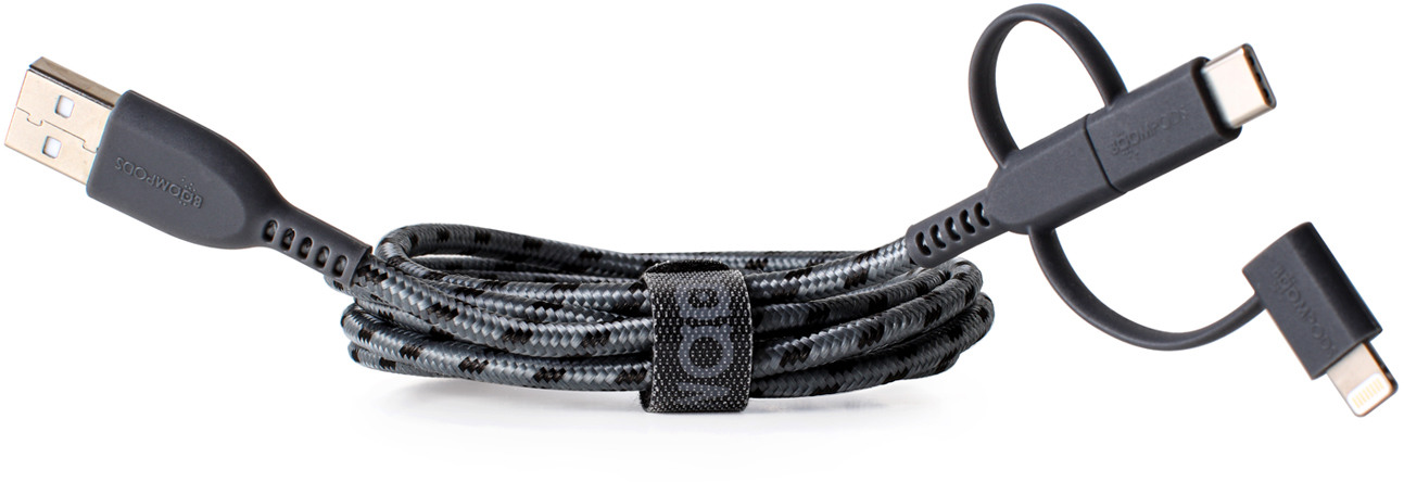 Le matériau tressé extérieur est constitué de plastique lié à l'océan. Avec une entreprise sociale locale, le plastique est séparé, nettoyé et transformé en fil, ce qui donne notre câble incroyablement solide. Le tout est complété par un blindage en aluminium et un support de câble fourni avec une fermeture velcro.