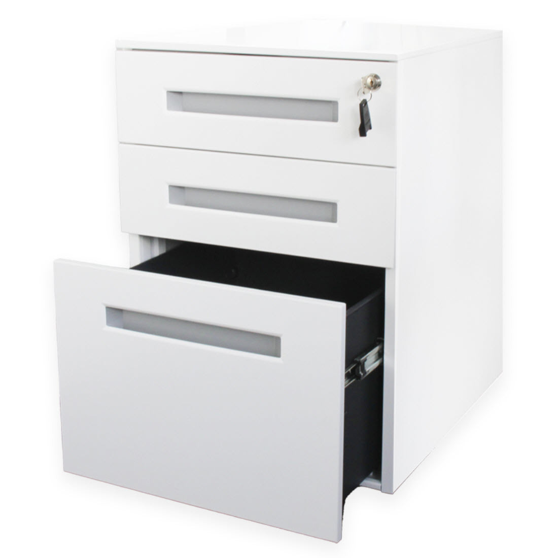 Le caisson à roulettes Contini, d'un blanc élégant, est la solution parfaite pour ton bureau ou ton home-office. Équipé de trois tiroirs spacieux, ce caisson à roulettes offre beaucoup d'espace de rangement et assure l'ordre et la clarté.Ce caisson à roulettes dispose de quatre roues faciles à manœuvrer, ce qui te permet une flexibilité et une mobilité maximales. Les tiroirs sont verrouillables, ce qui permet de conserver tes documents et effets personnels en toute sécurité.Le tiroir du bas est spécialement conçu pour les dossiers suspendus, afin de garantir un classement simple et ordonné de tes documents. Veuillez noter que les dossiers suspendus ne sont pas inclus dans la livraison.