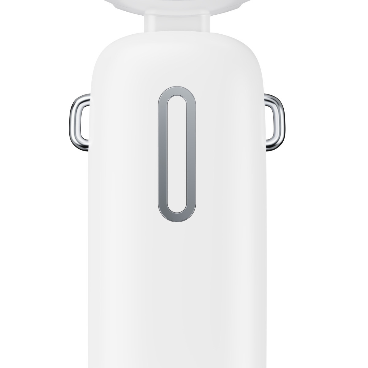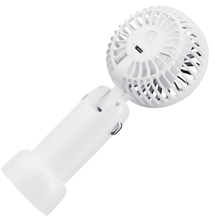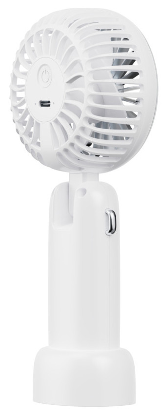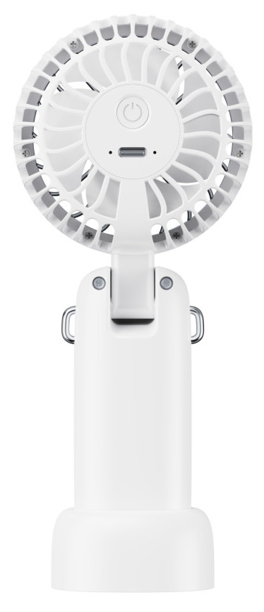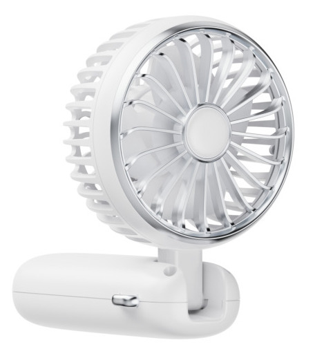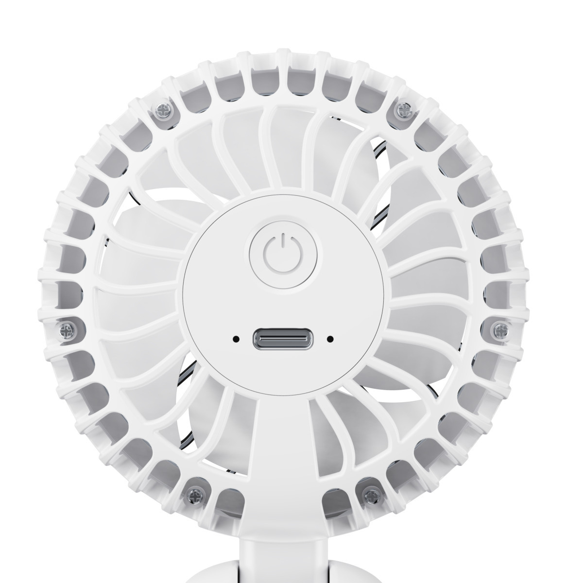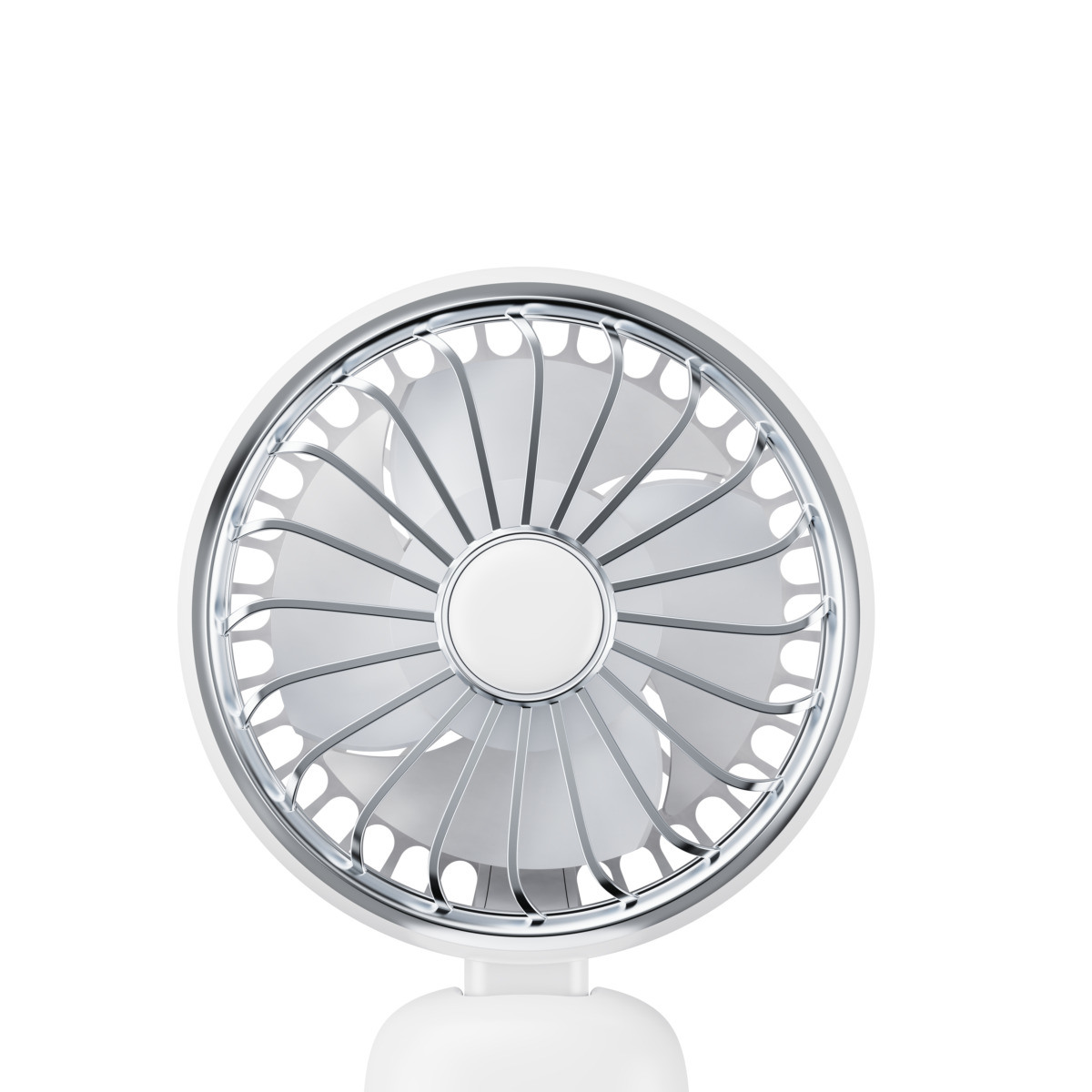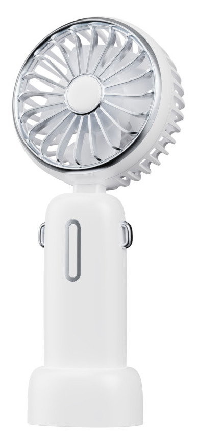 Ventilateur portable avec sangle de cou. Batterie rechargeable de 2000mAh. Multispeed (à plusieurs vitesses). Couleur blanche, avec détails argentés.