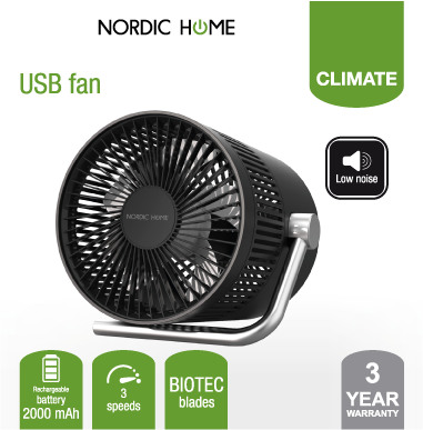 NORDIC HOME Ventilateur USB avec pales bioniques, 3 vitesses et batterie rechargeable, blanc/noir