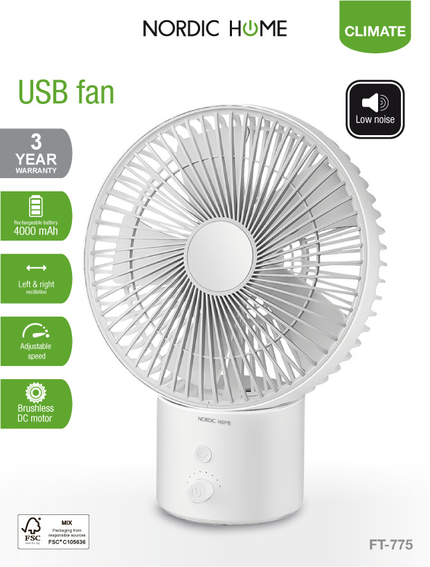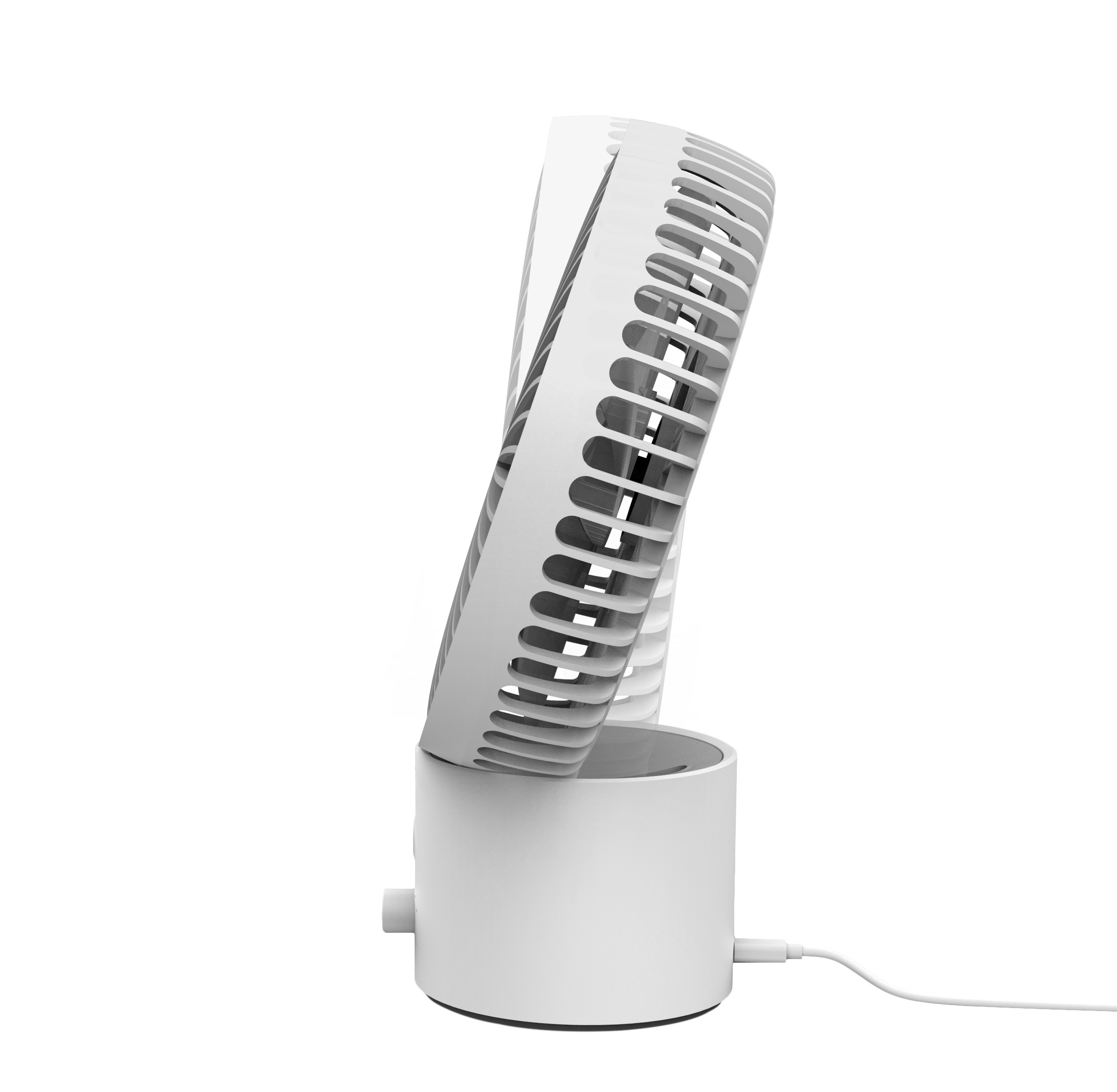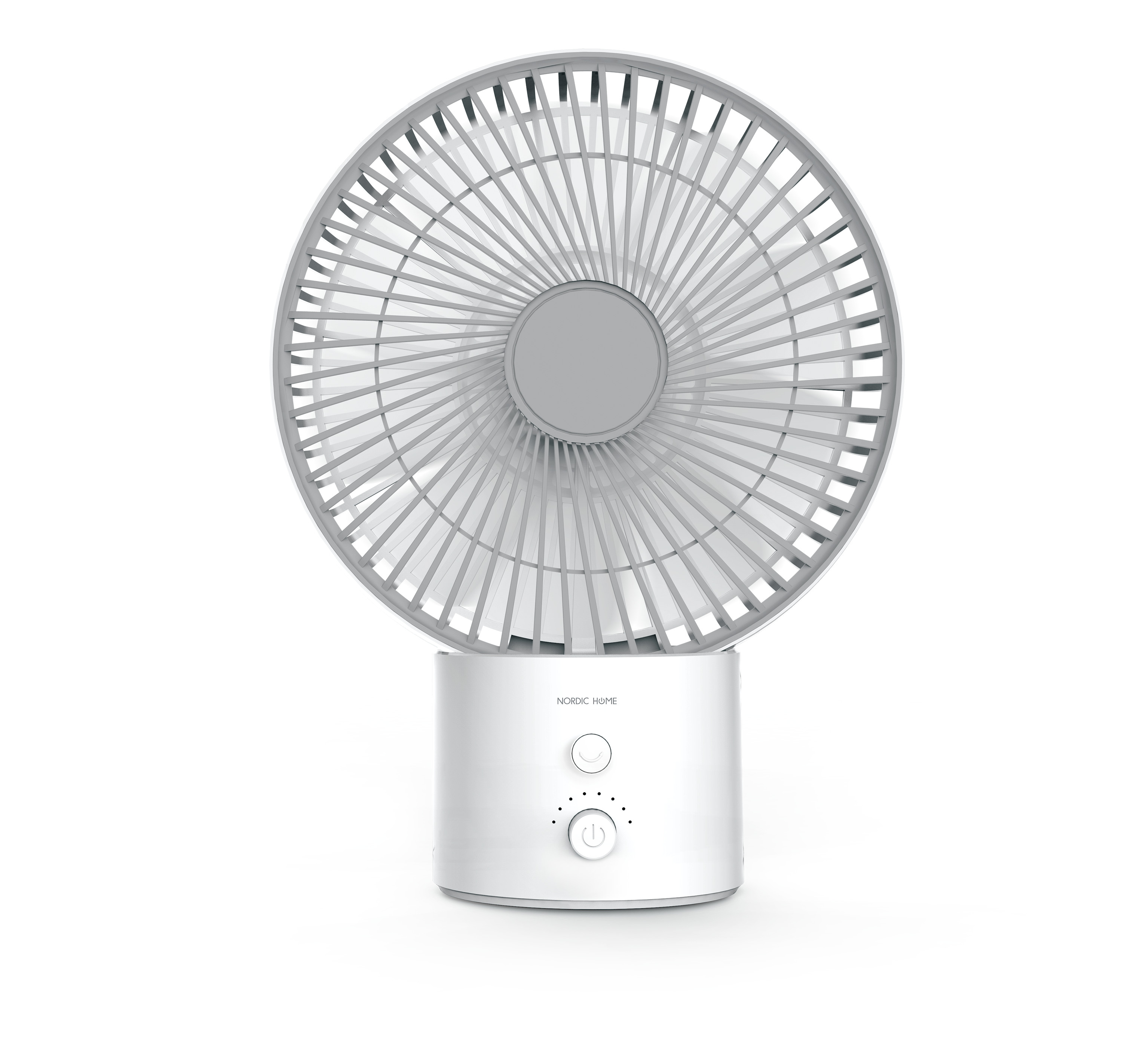 Ventilateur USB rechargeable avec batterie au lithium intégrée, plusieurs vitesses, fonction d'oscillation et angle d'inclinaison de 24°. 5V 6,5W, batterie au lithium 4400nAh