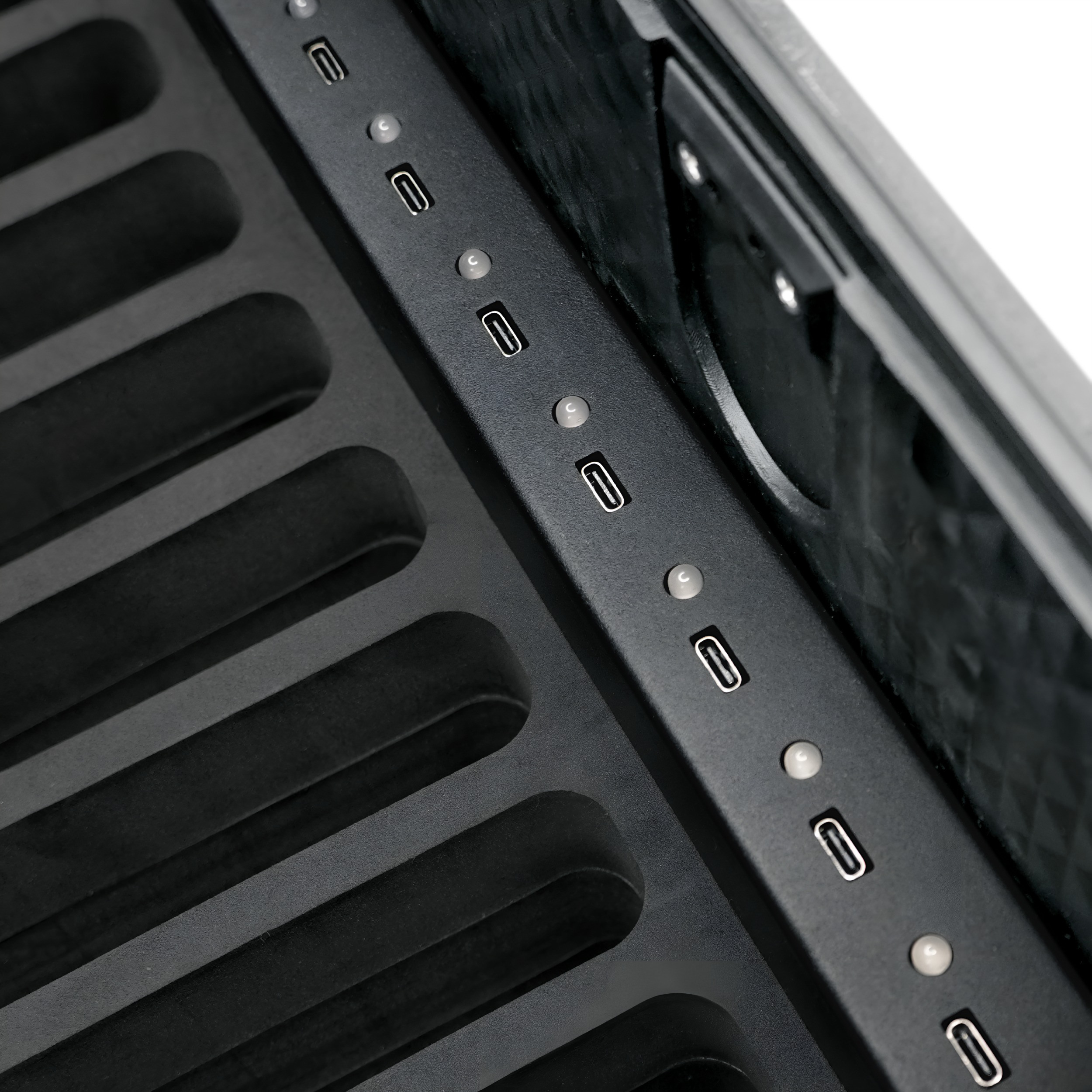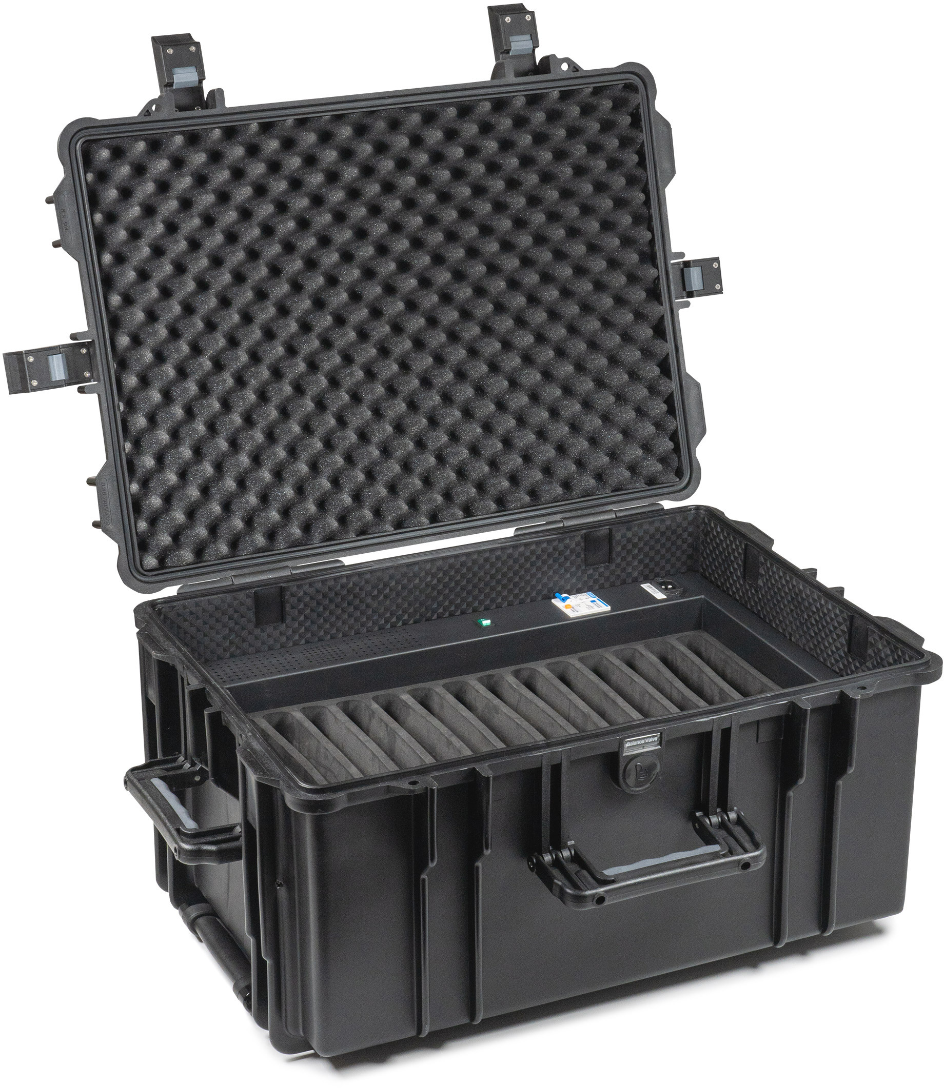 Prêt à charger en quelques instants : ouvrir le trolley, brancher le câble d'alimentation dans la prise de courant, raccorder le câble USB approprié aux appareils - c'est tout. Les câbles USB-C fournis offrent une flexibilité maximale grâce à des connecteurs coudés et évitent les enchevêtrements de câbles. Des voyants LED situés à côté des ports USB indiquent l'état de chargement : vert : chargement terminé, rouge : tablette en cours de chargement. Pour protéger le bloc d'alimentation interne contre la surchauffe, le chariot de chargement est équipé d'un ventilateur puissant et silencieux. Le trolley est étanche à l'eau et à la poussière selon la classe de protection IP67 et offre grâce à un boîtier en ABS robuste et résistant quatre fermetures verrouillables. Des roulettes durables et une poignée télescopique facilitent le transport entre les différentes pièces. Le rembourrage en mousse à l'intérieur protège en outre les tablettes des rayures et des chocs.
