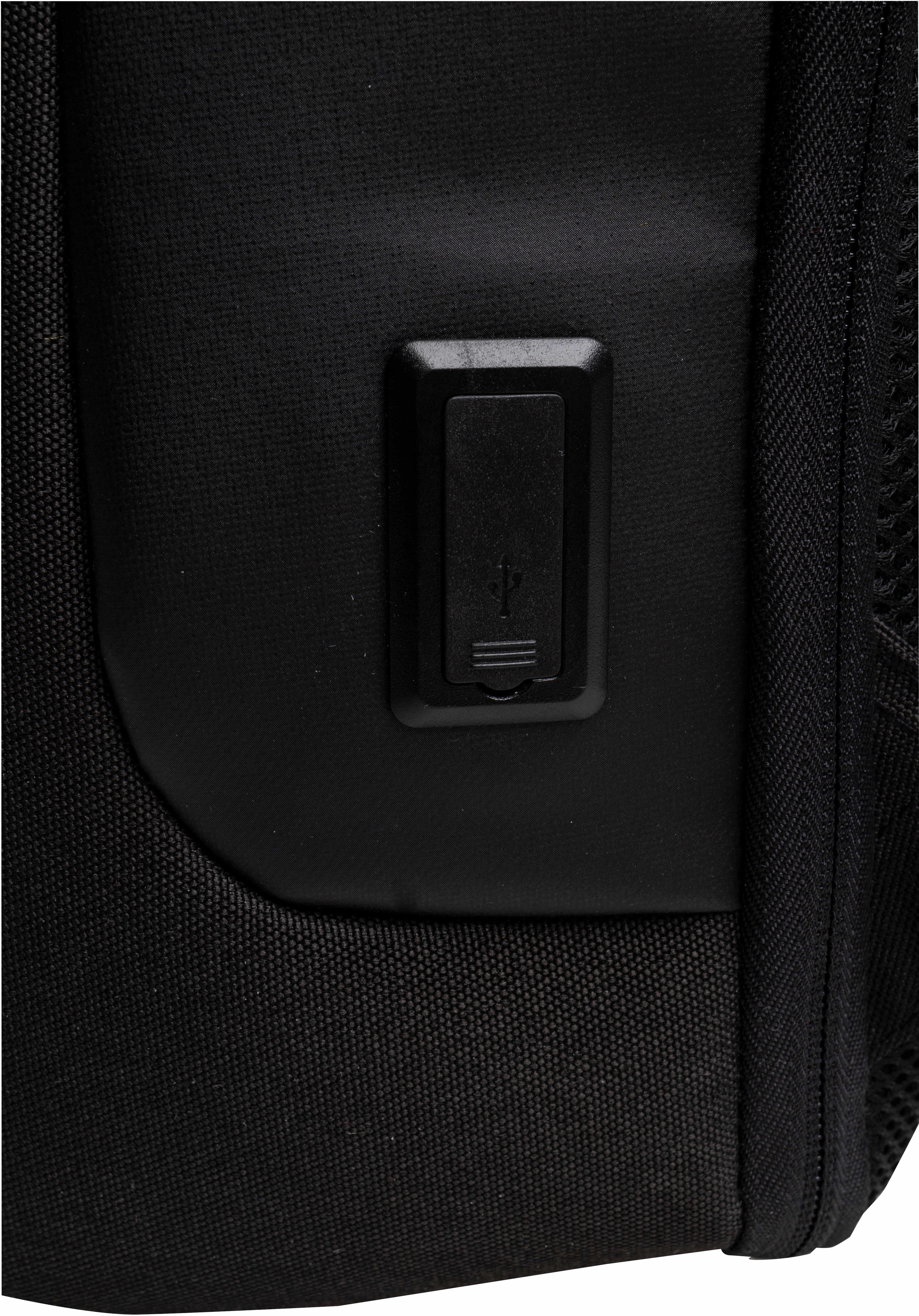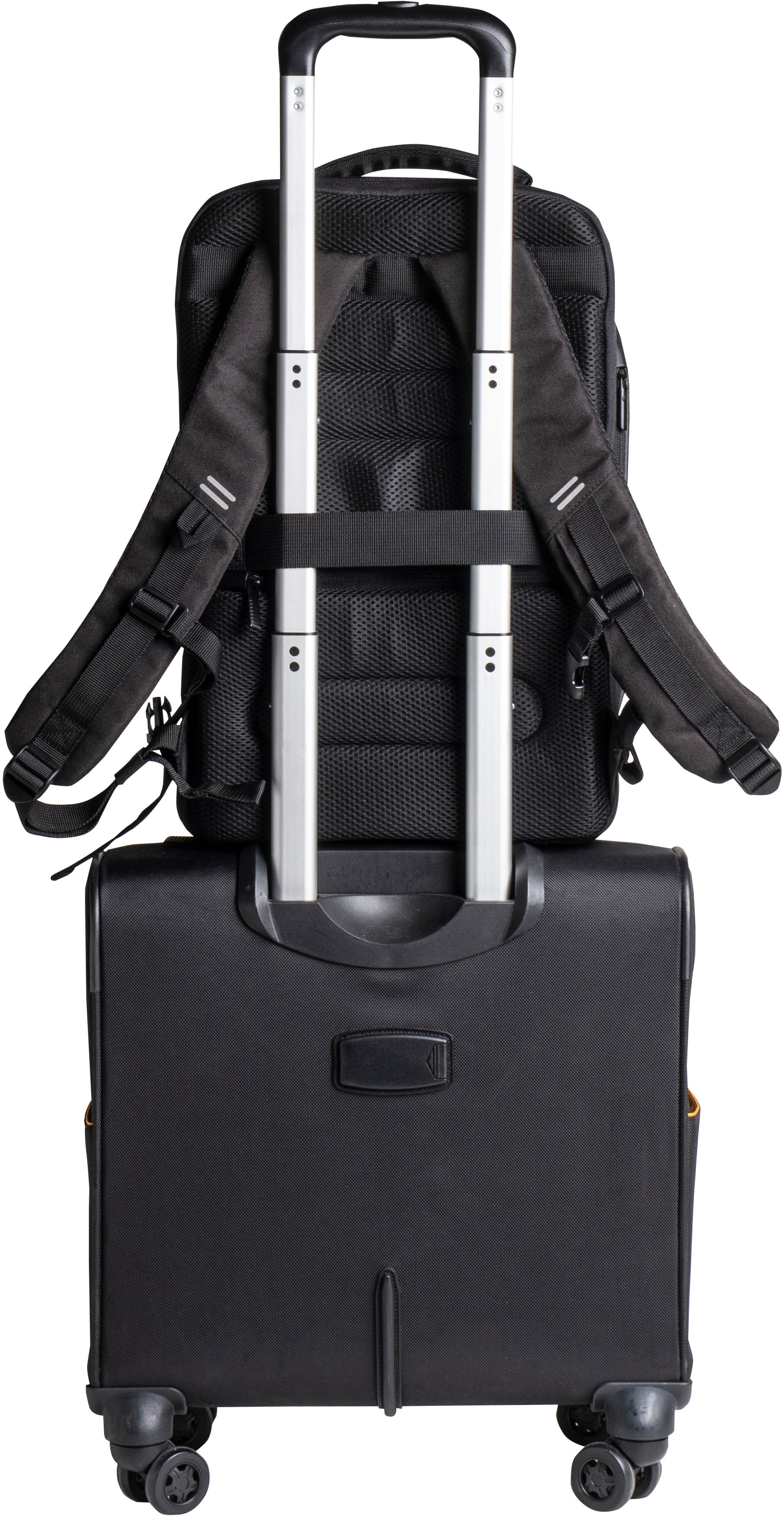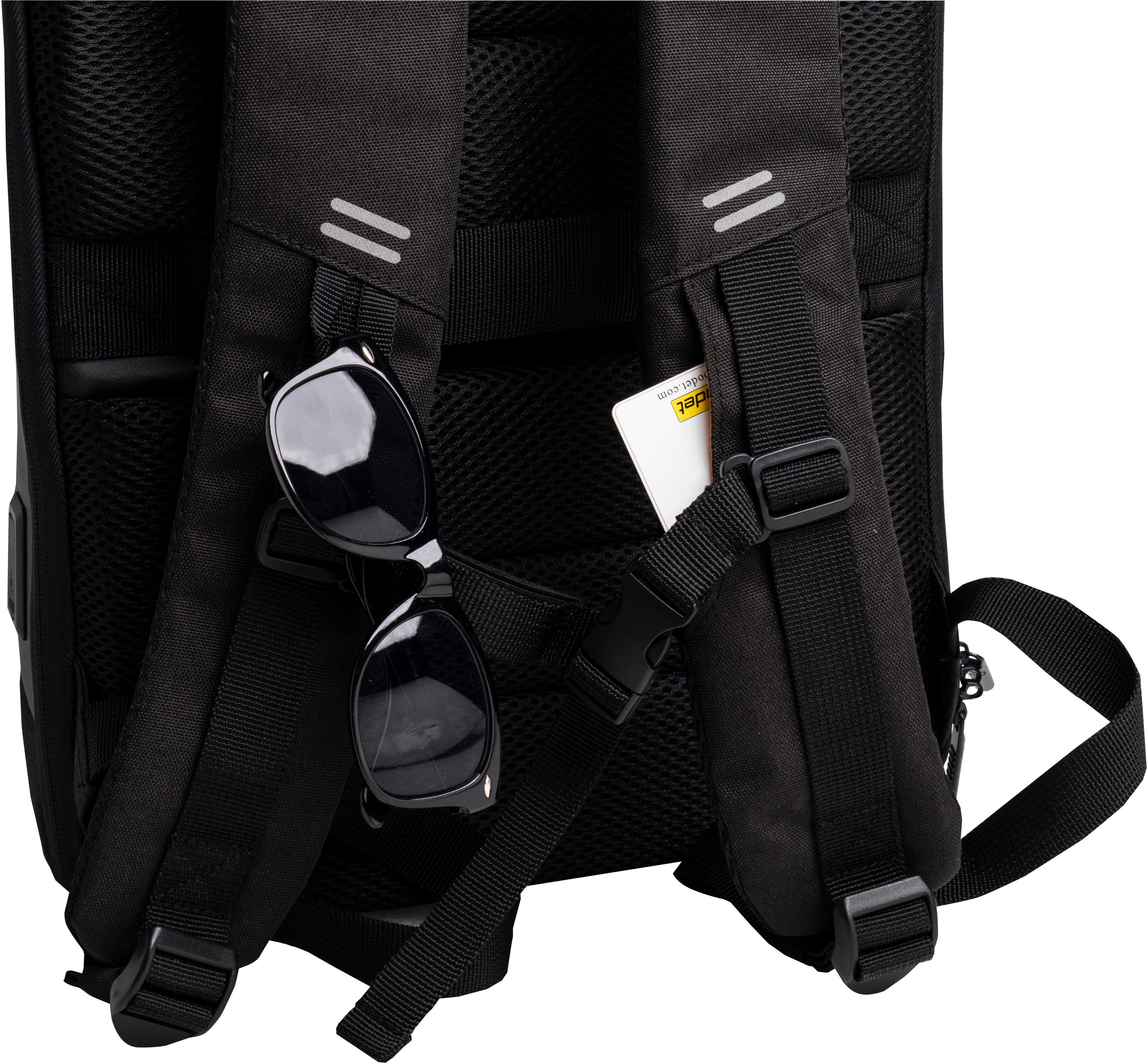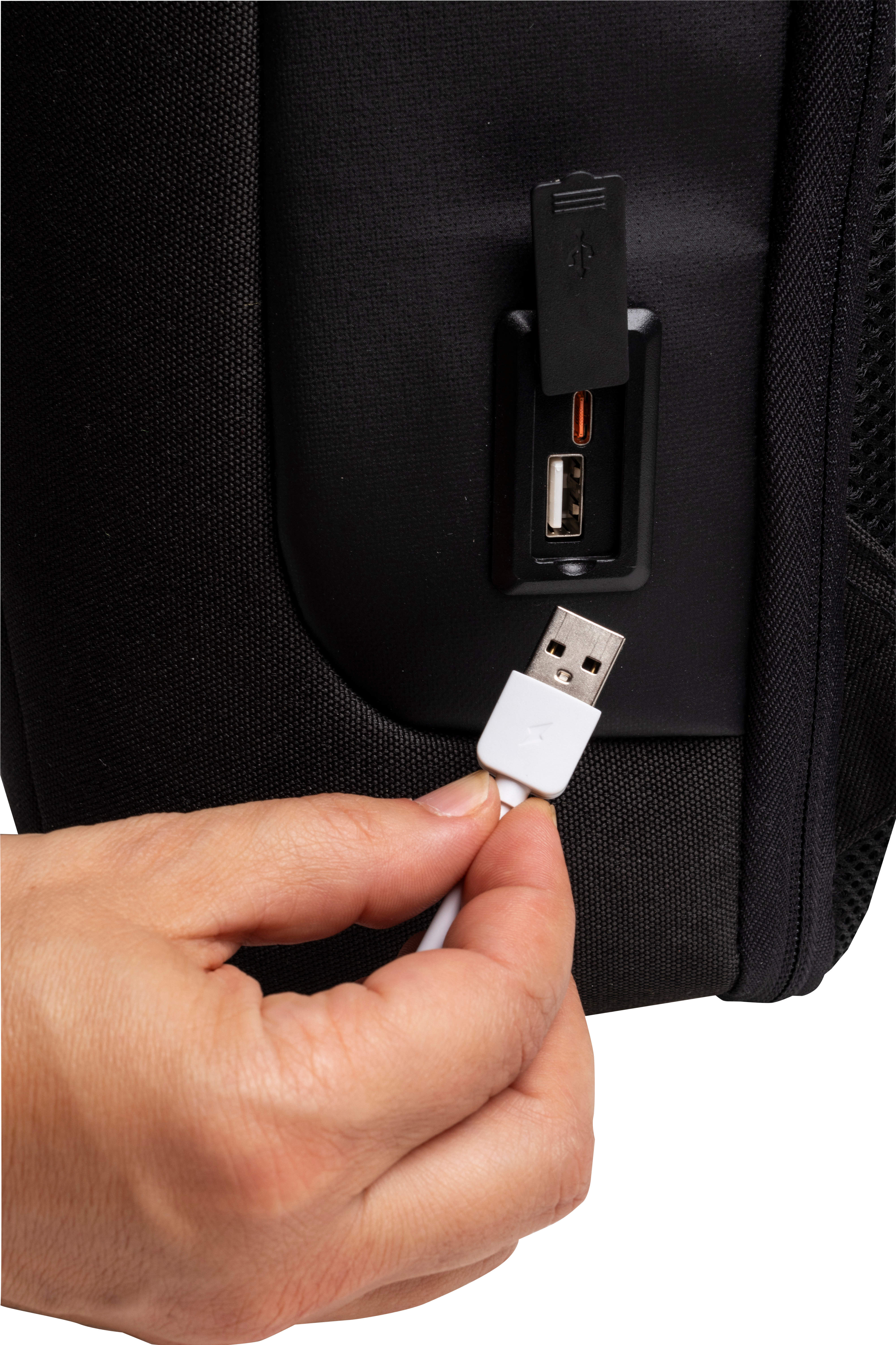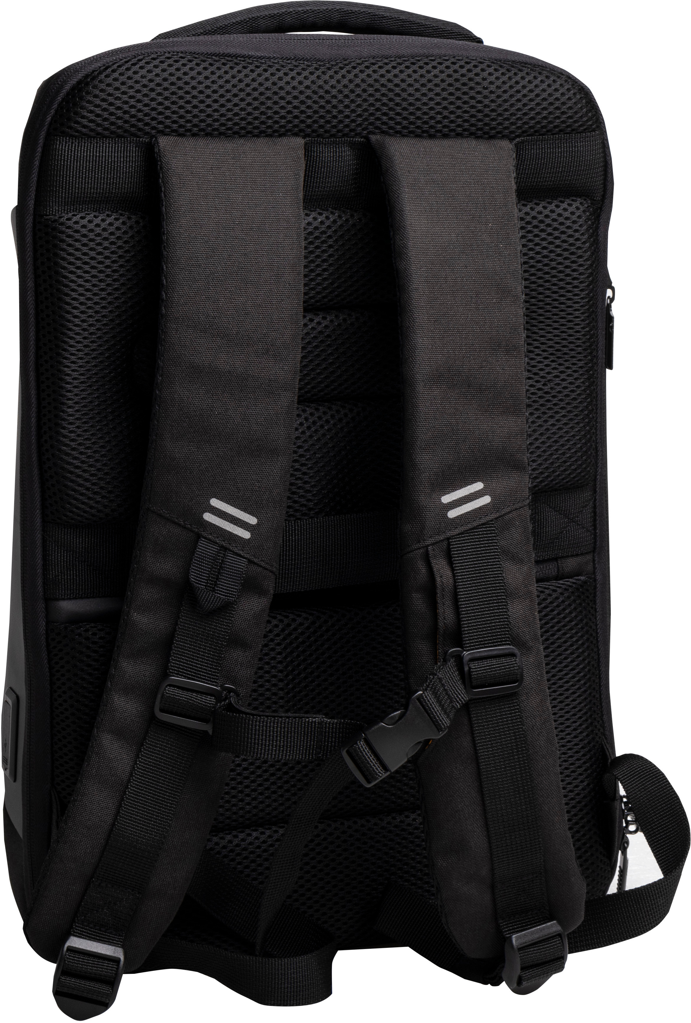 Sac à dos à coque pour ordinateur portable, 31x45x15 cm, Exactive Le sac à dos à coque Exactive est confortable et pratique pour le transport de l'ordinateur portable, des accessoires et des documents. L'accès au compartiment principal se fait par l'arrière du sac à dos, ce qui offre une meilleure protection contre le vol. Le compartiment principal dispose de deux poches séparées et rembourrées pour tablette et ordinateur portable jusqu'à 16 ans, ainsi que de plusieurs poches intérieures zippées pour organiser le contenu. Le contenu du sac peut être divisé en deux zones distinctes grâce à une cloison amovible. Dans la poche latérale se trouve une housse imperméable qui permet de protéger le sac en cas de mauvais temps. Une boucle à l'arrière permet d'accrocher le sac à la poignée télescopique d'une valise. Avec une petite poche zippée à l'arrière pour un accès rapide au porte-monnaie, au smartphone ... Il est possible de recharger un téléphone ou une tablette via le port USB intégré (le câble et le chargeur ne sont pas fournis). Particulièrement adapté aux cyclistes et aux motards : la poche latérale étanche contient une housse imperméable qui permet de protéger le sac en cas de mauvais temps. Le dos et les bretelles sont constitués d'une mousse en maille qui assure un meilleur confort et permet d'évacuer la transpiration. Sangle de poitrine réglable pour un ajustement parfait et un bon maintien. Bandes réfléchissantes pour une meilleure visibilité de nuit. Fabriqué en polyester à partir de bouteilles d'eau recyclées (RPET). Capacité : 16 litres. Garantie de 2 ans.