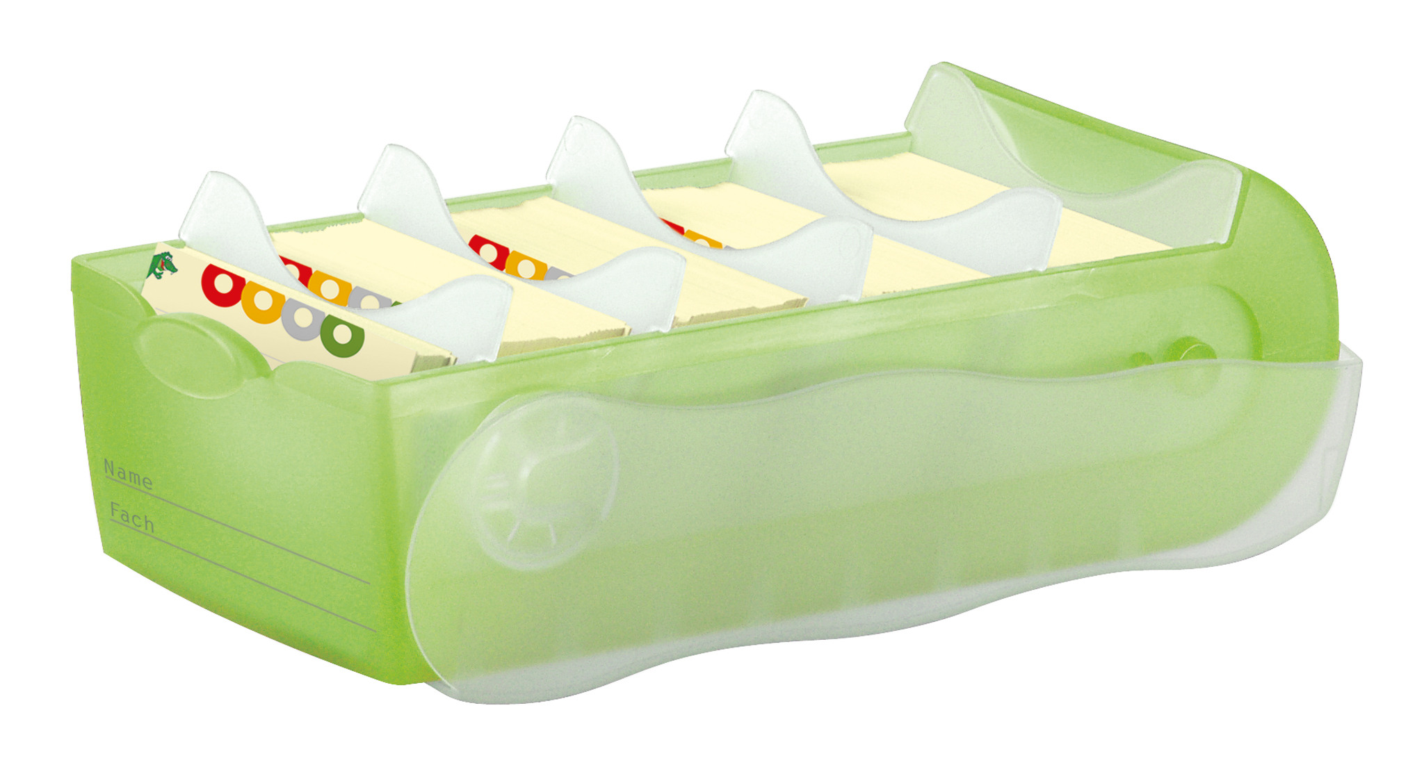 Boîte d'apprentissage pour téléphone et fiches Croco A7 - A l'ouverture, le couvercle disparaît sous la boîte, à l'état fermé, les supports sont bloqués - 100 fiches lignées incluses - 5 plaques de support variables et grande étiquette d'inscription - Contient jusqu'à 900 fiches - 100 fiches lignées incluses