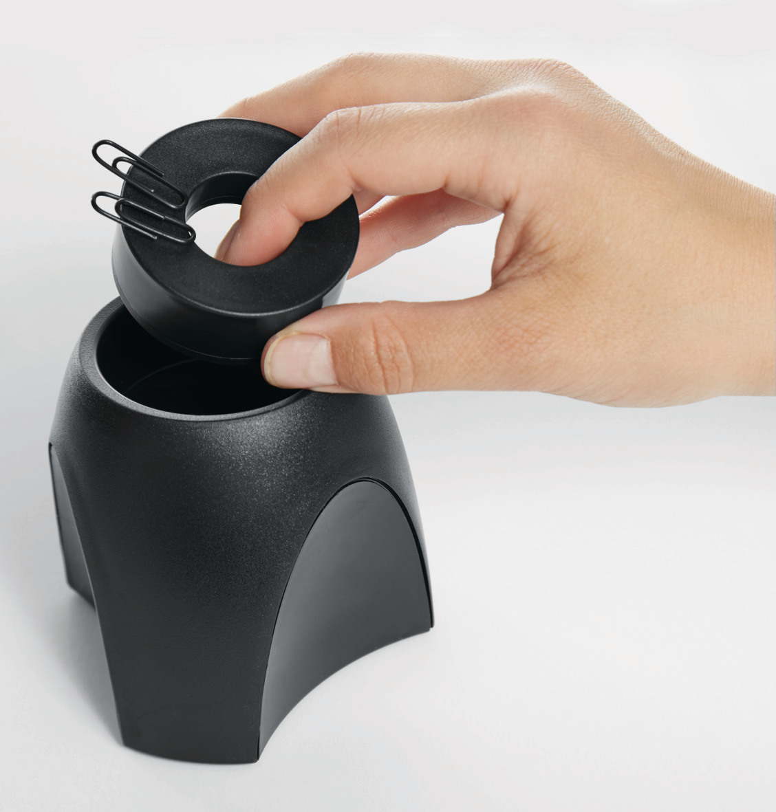 Le distributeur d'agrafes DELTA est stylé et élégant et possède une grande capacité. Les trombones sont toujours à portée de main et l'aimant amovible permet de les recharger facilement.