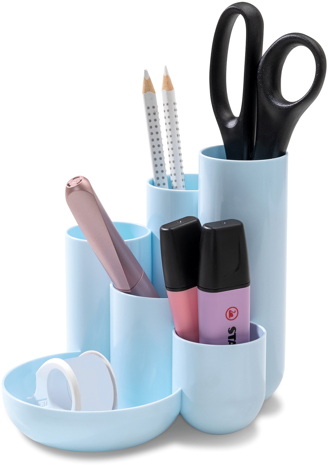 Le carquois de bureau CAMPUS avec 5 tubes et un bac pour le rangement de petits objets dans de nouvelles couleurs pastel est l'accroche-regard coloré pour chaque bureau.