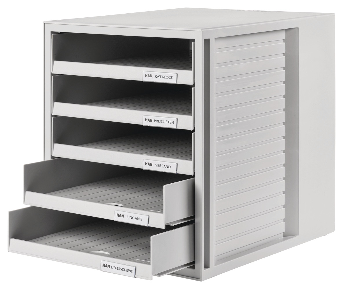Polystyrène, 5 tiroirs avec arrêt et matériel d'inscription. Convient aux armoires normées.