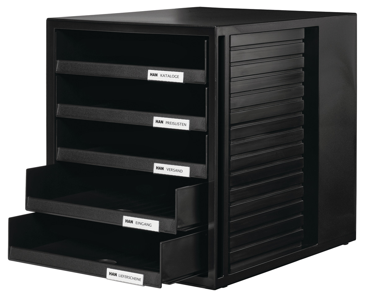 Polystyrène, 5 tiroirs avec arrêt et matériel d'inscription. Convient aux armoires normées.