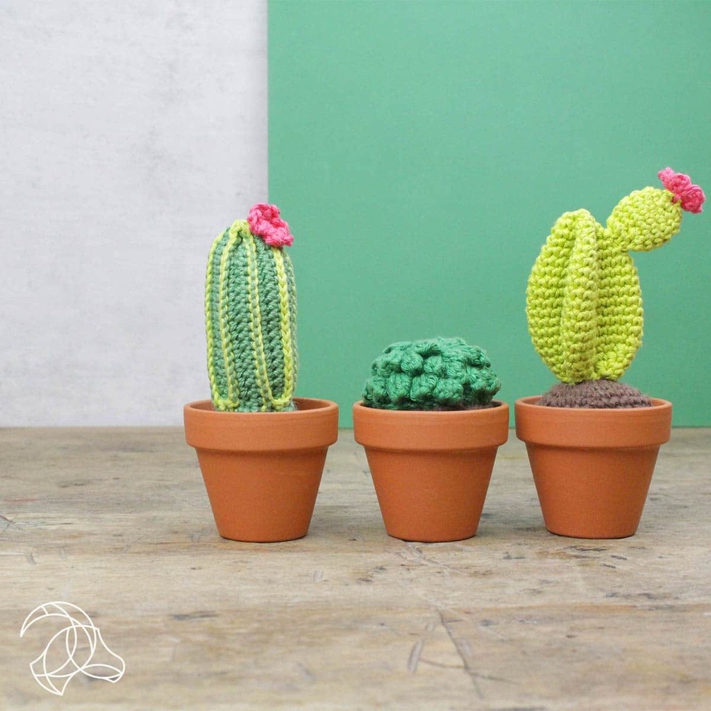 Quelle façon amusante d'ajouter de la couleur à votre pièce ! Ces cactus à la mode sont un excellent complément pour la maison ou le bureau, ainsi qu'un super cadeau. Ce paquet contient du fil de haute qualité 100% coton et toute la mercerie, sauf le crochet dont tu as besoin. Les cactus mesurent entre 7 et 13 cm de haut, pot compris, et sont réalisés au crochet avec un crochet de 2,5 mm.
