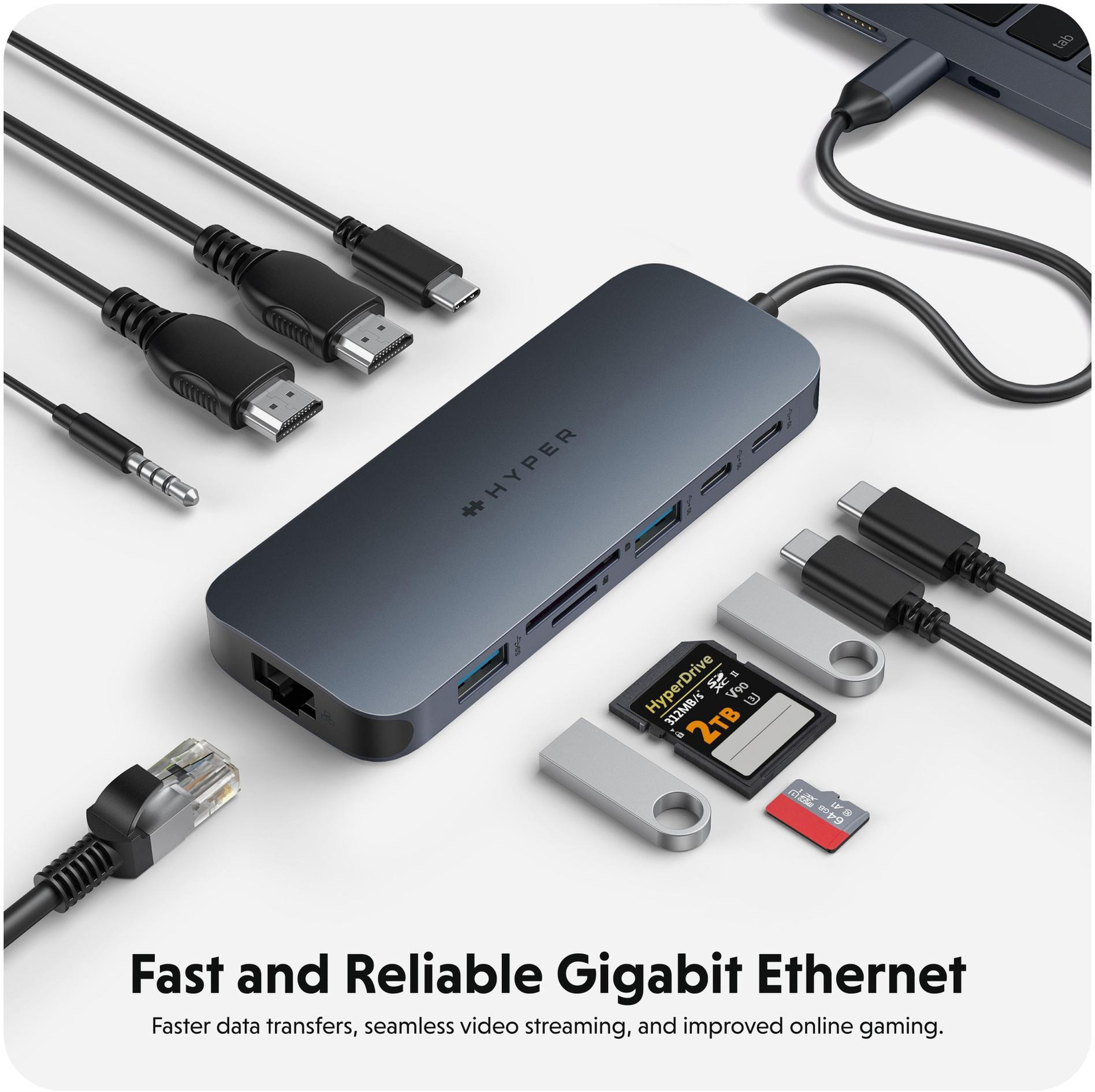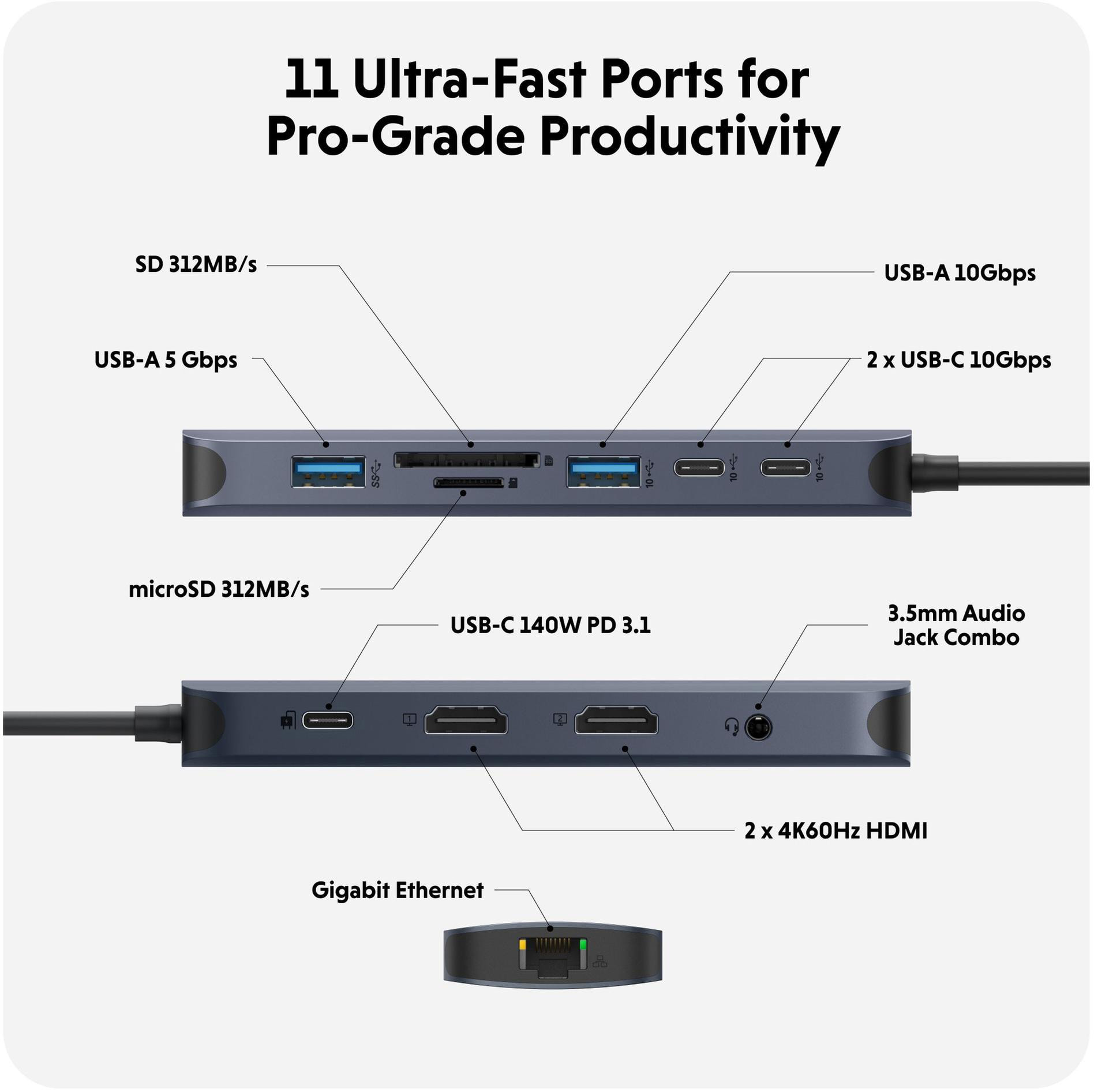 Nous présentons l'HyperDrive® Next 11 Port USB-C Hub - la solution de connectivité ultime pour les créatifs, les rédacteurs, les photographes et plus encore. Avec la prise en charge de deux écrans 4K 60 Hz* pour PC et Chromebook™, 11 ports ultra-rapides et des transferts de données à la vitesse de l'éclair, vous pouvez libérer votre potentiel créatif où que vous soyez. Profitez de transferts de fichiers 2 fois plus rapides avec les ports USB 10 Gbit/s et de transferts de photos et de vidéos 3 fois plus rapides avec les cartes microSD et SD 4.0. Bénéficiez de 40 % de puissance en plus avec le PD 3.1 140 W Power Pass-Through, qui garantit une recharge efficace. Maximisez votre productivité avec le Hub HyperDrive® Next 11 Port Dual 4K USB-C.