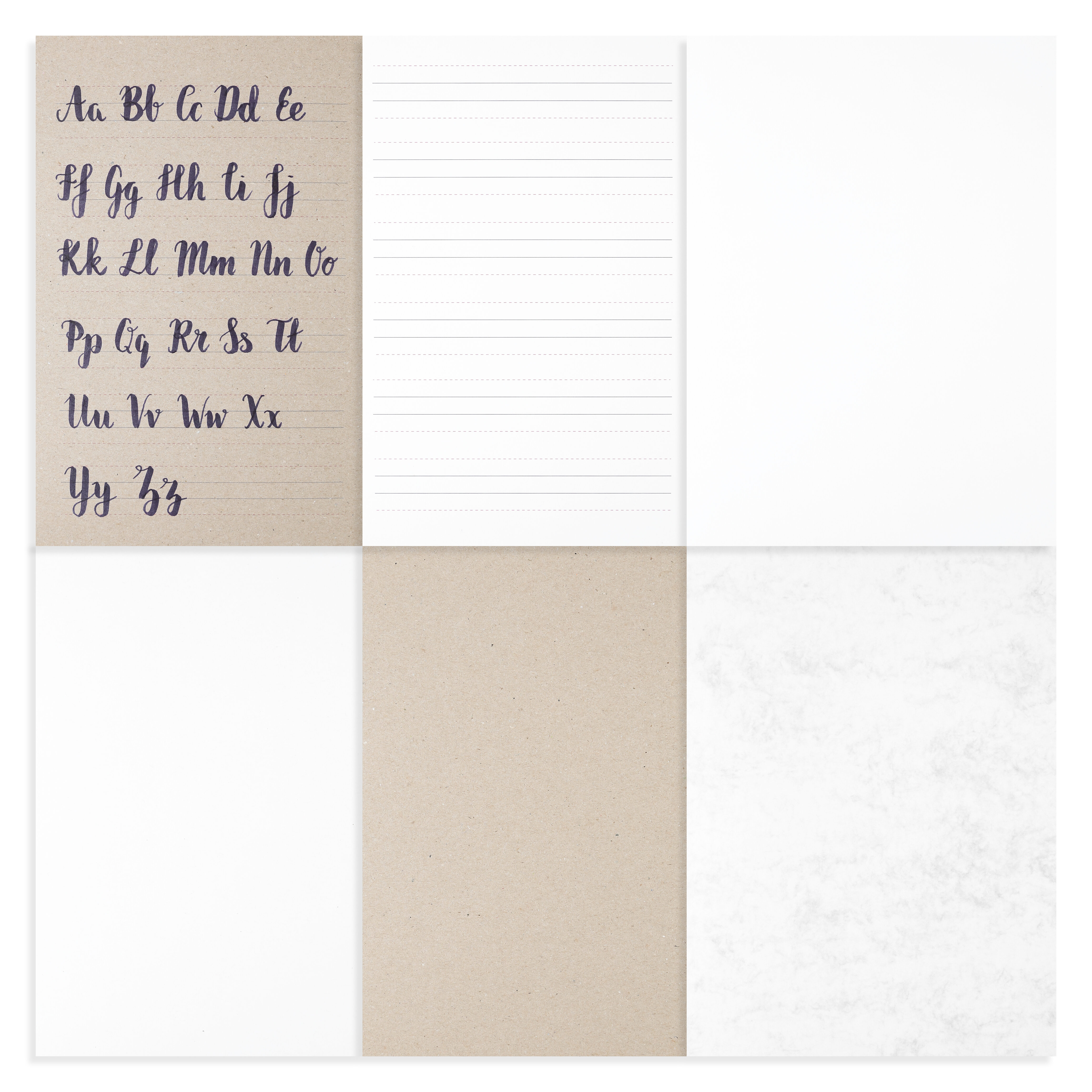 Format A4 - 50 feuilles - 10 feuilles 240 g/m2 blanc avec lignes, 10 feuilles 240 g/m2 blanc, 10 feuilles 220 g/m2 papier kraft blanc, 10 feuilles 220 g/m2 papier kraft gris, 10 feuilles 200 g/m2 marbre gris/blanc - Intérieur du bloc imprimé avec des modèles de lettres de brushlettering