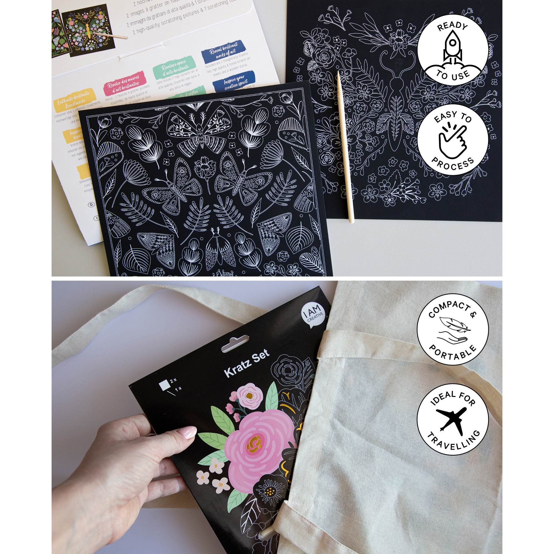 Créer des œuvres d'art uniques et magiques par simple grattage. Qu'il s'agisse d'images, d'inscriptions ou de simples contours, toutes les images deviennent uniques avec ce Scratch Block. Le papier recouvert d'une feuille d'or est recouvert de noir de couverture. En grattant avec les crayons inclus dans le set, la couleur dorée devient visible en dessous. Cette technique permet de graver des dessins, des motifs et des inscriptions. Un plaisir pour les jeunes et les moins jeunes.