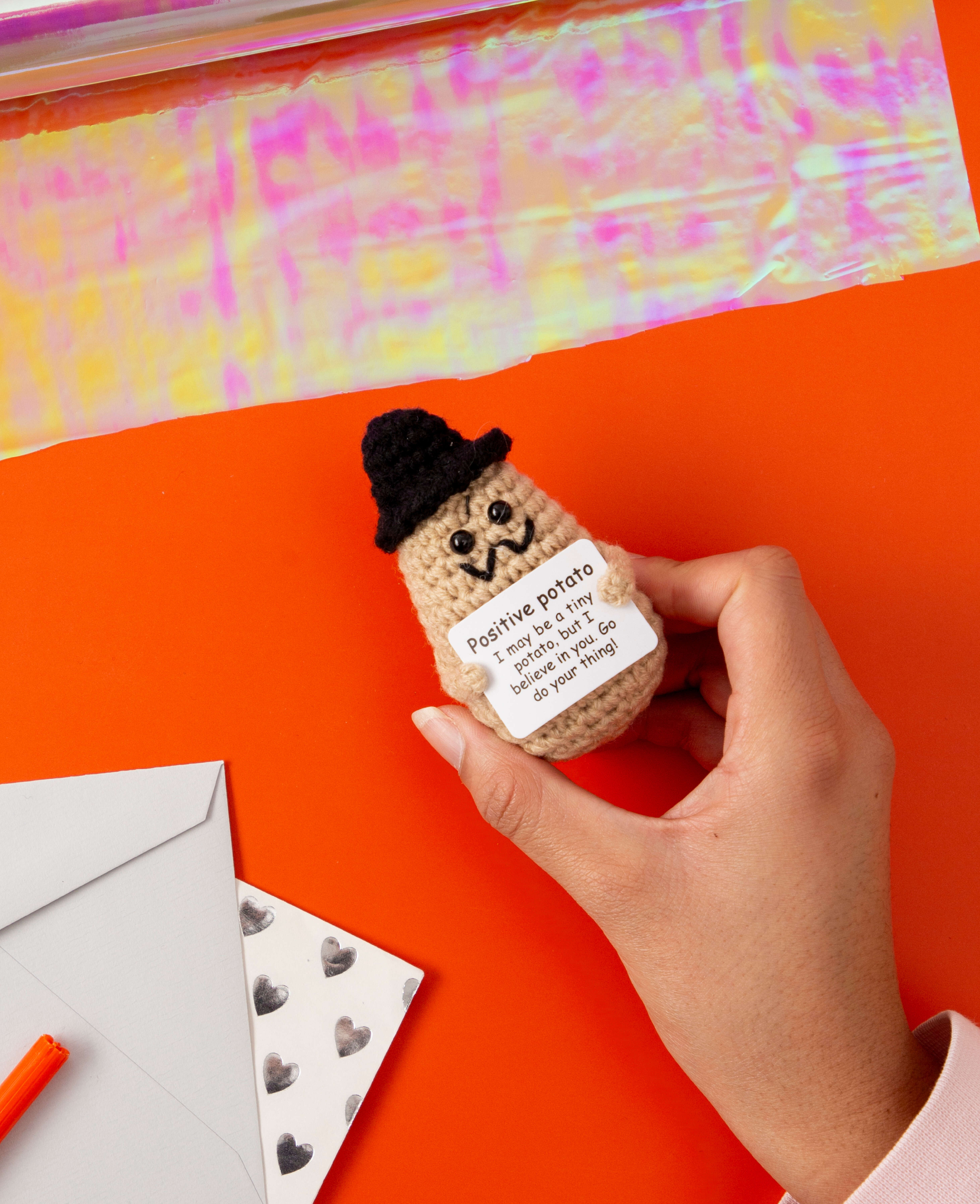 Tu cherches un cadeau original ? Alors commande dès aujourd'hui cette adorable Patate positive avec chapeau ! Cette peluche crochetée est idéale comme cadeau, encouragement ou porte-bonheur. Pose la pomme de terre sur ton bureau, ta table de nuit ou emmène-la avec toi lors d'examens importants. Offre la mini peluche à une personne qui t'est chère et fais-lui sourire !