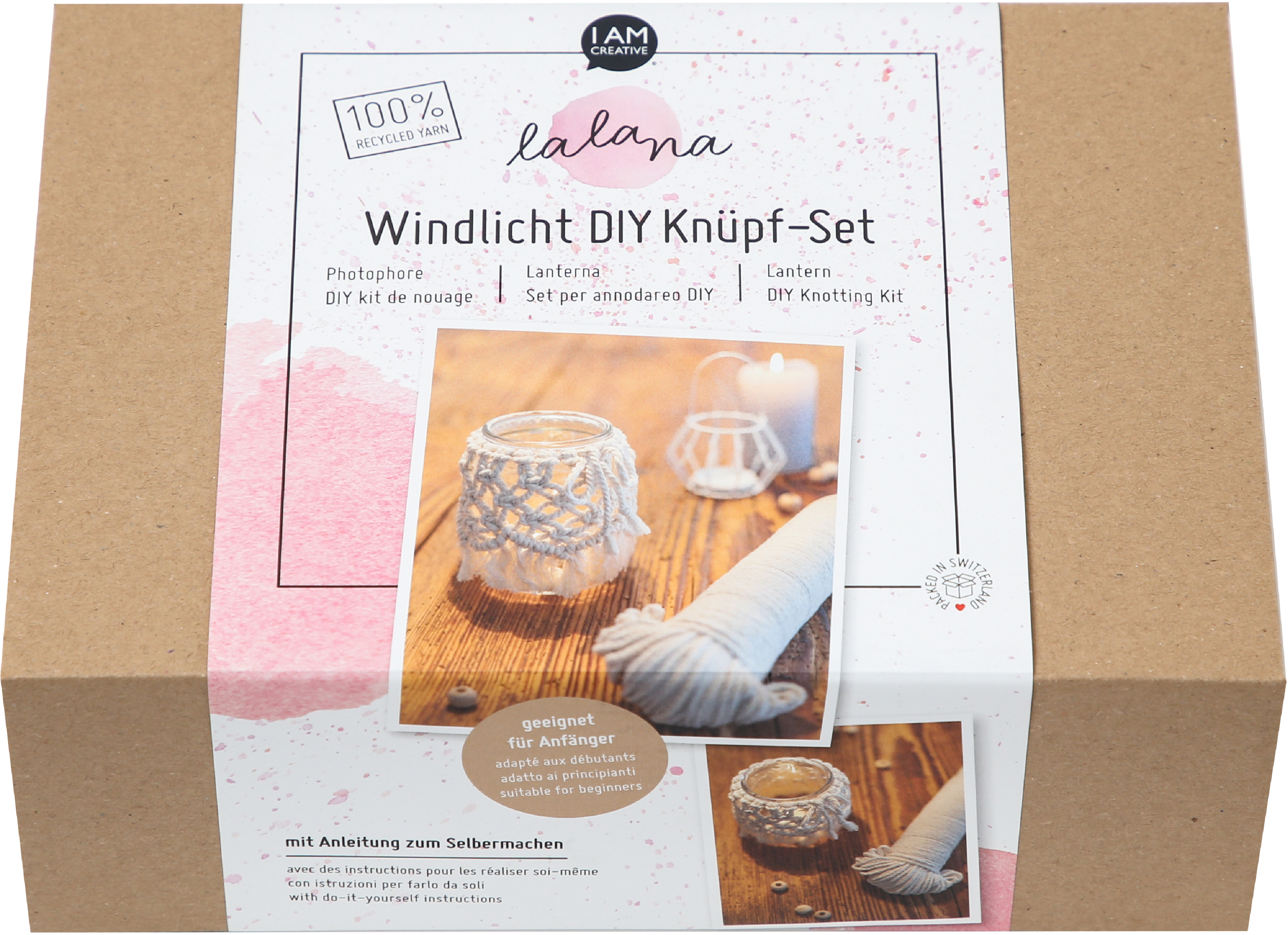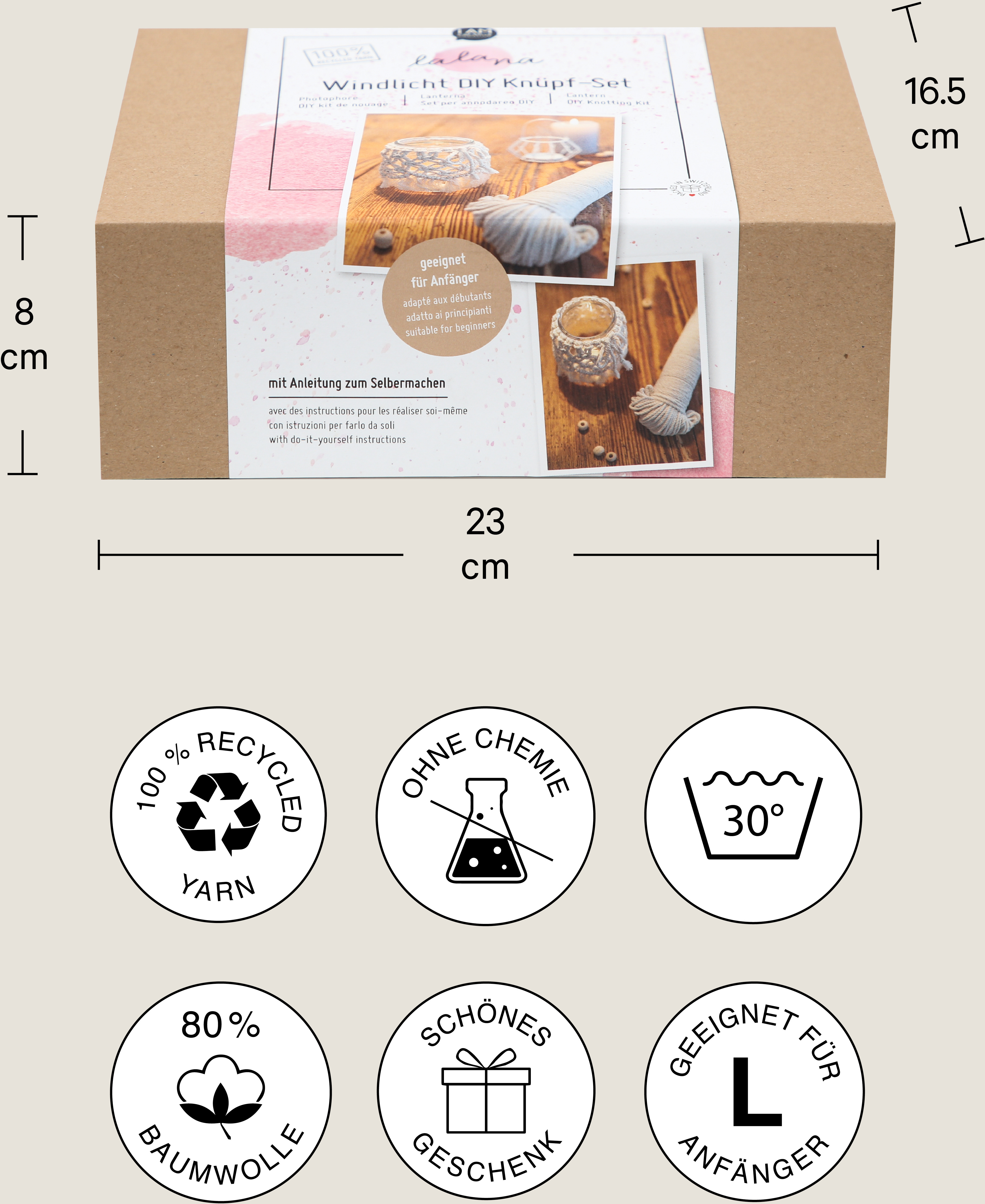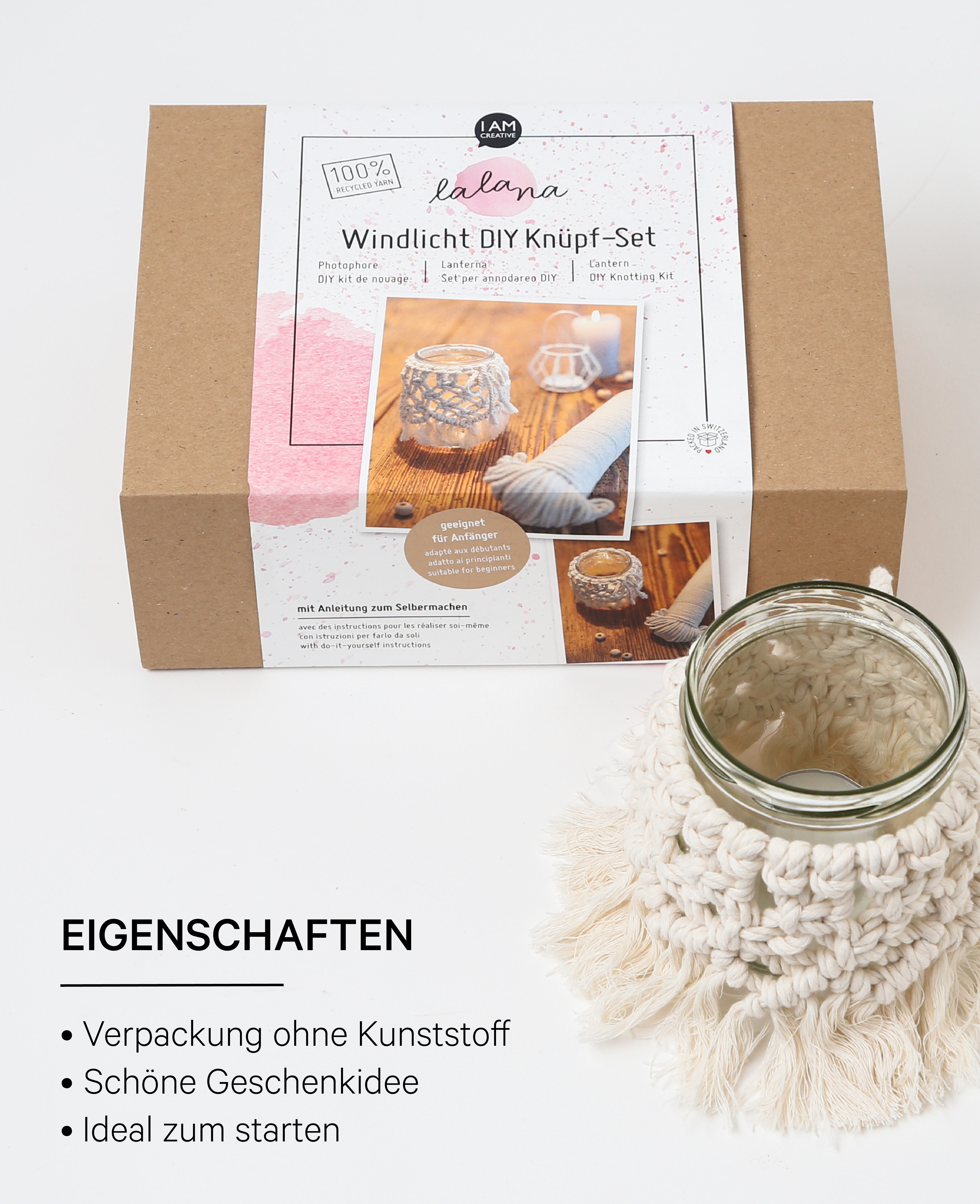 Détendez-vous du stress quotidien en nouant, nouant et tressant! Avec ce kit, nous vous montrons étape par étape comment vous pouvez facilement concevoir vous-même une lanterne décorative avec du fil à nouer. L'ensemble convient aussi bien aux débutants qu'aux professionnels dans le domaine du nouage. Le verre transparent et cylindrique pour bougies chauffe-plat avec un support en fil de métal argenté a une base solide et est idéal à des fins décoratives. Le fil textile 100% recyclé est composé à 80% de coton et à 20% de fibres mélangées, particulièrement résistant et durable. La lanterne est parfaite pour créer une atmosphère chaleureuse et est également un cadeau idéal pour vos amis et votre famille.