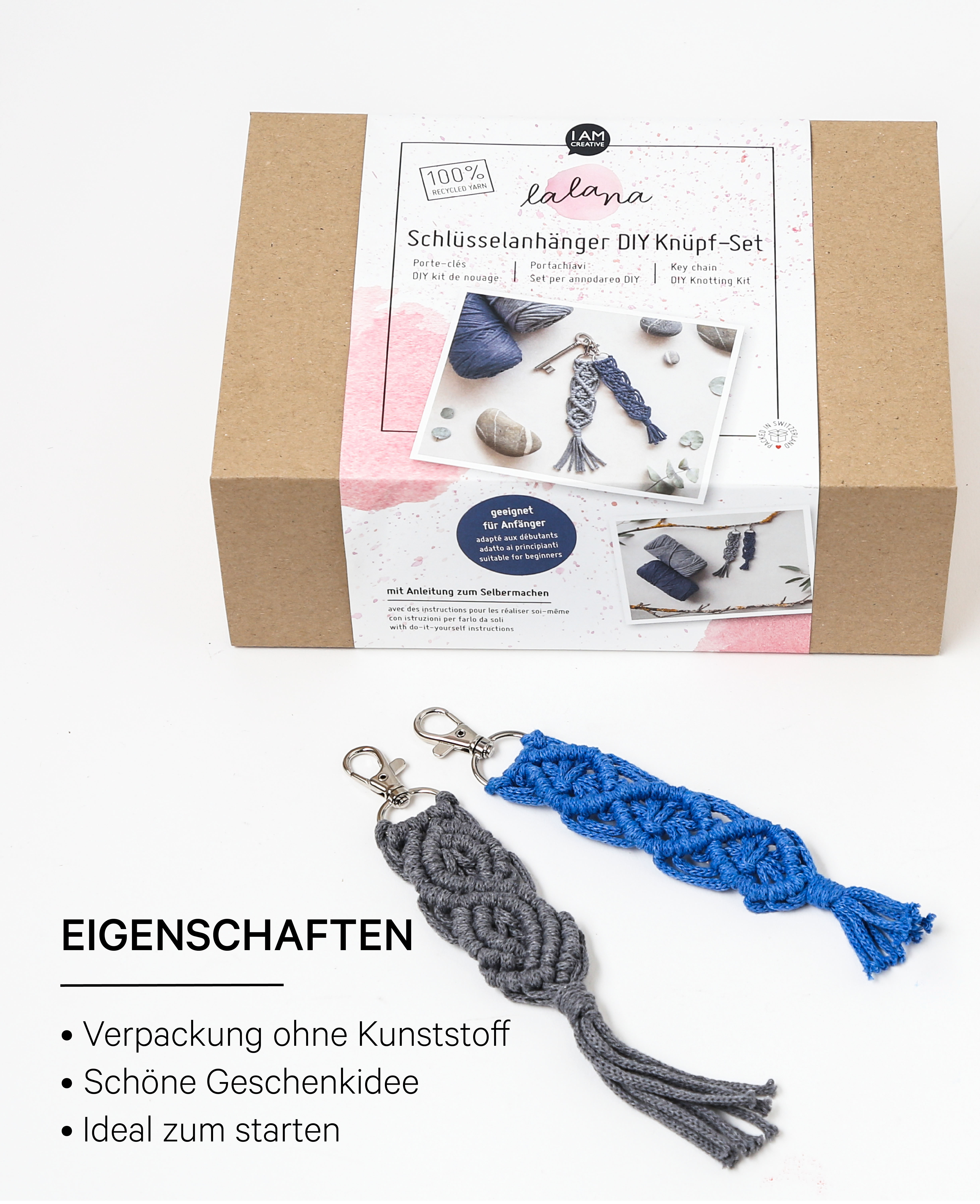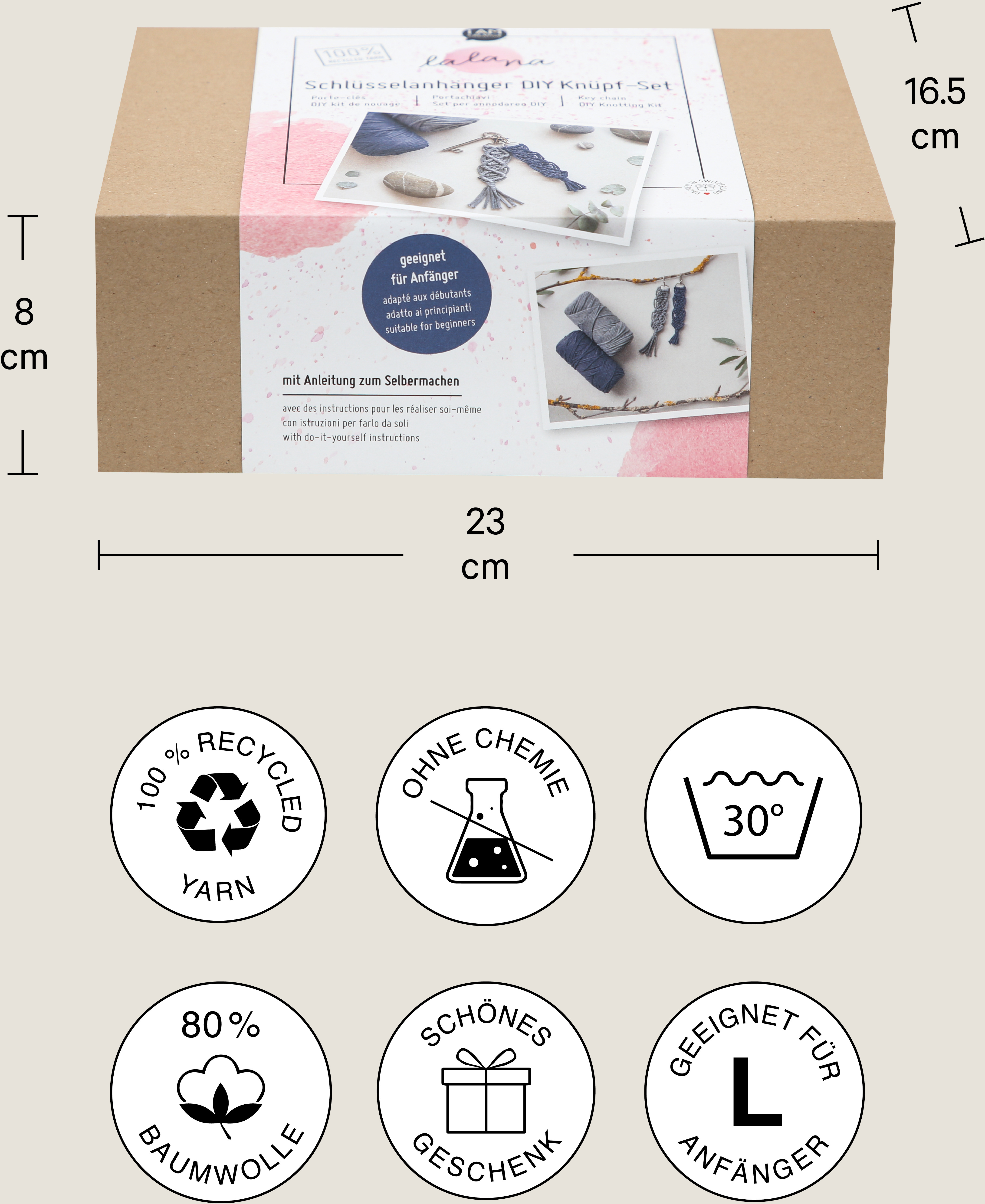 Détendez-vous du stress quotidien en nouant, nouant et tressant! Avec ce kit, nous vous montrons étape par étape comment nouer facilement vous-même des porte-clés décoratifs avec des mousquetons. L'ensemble convient aussi bien aux débutants qu'aux professionnels dans le domaine du nouage. Les mousquetons sont robustes et fabriqués en métal de haute qualité, ce qui les rend idéaux pour une utilisation quotidienne. Le fil textile 100% recyclé est composé à 80% de coton et à 20% de fibres mélangées, particulièrement résistant et durable. Les pendentifs sont parfaits pour un usage quotidien et sont également idéaux comme cadeau pour vos amis et votre famille.