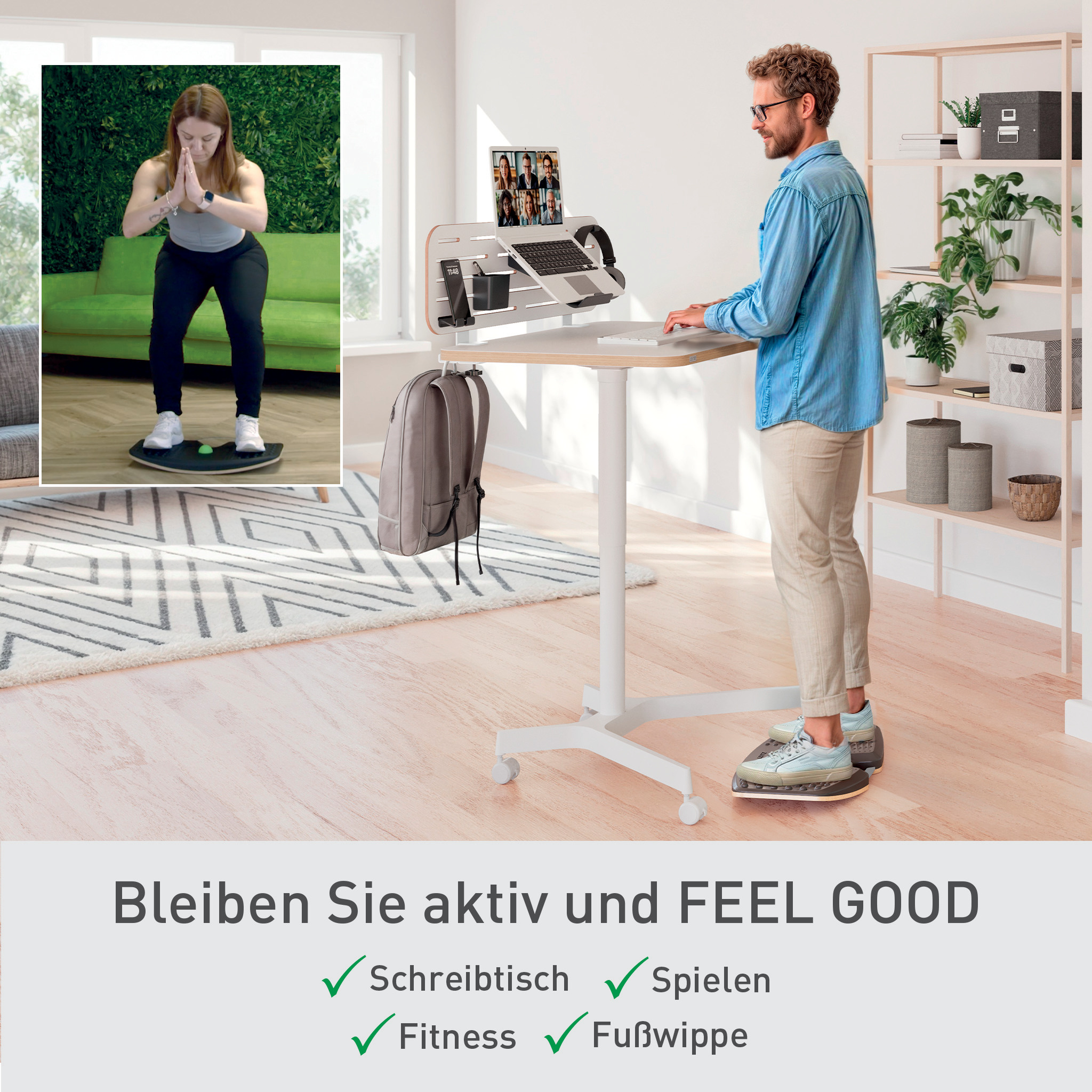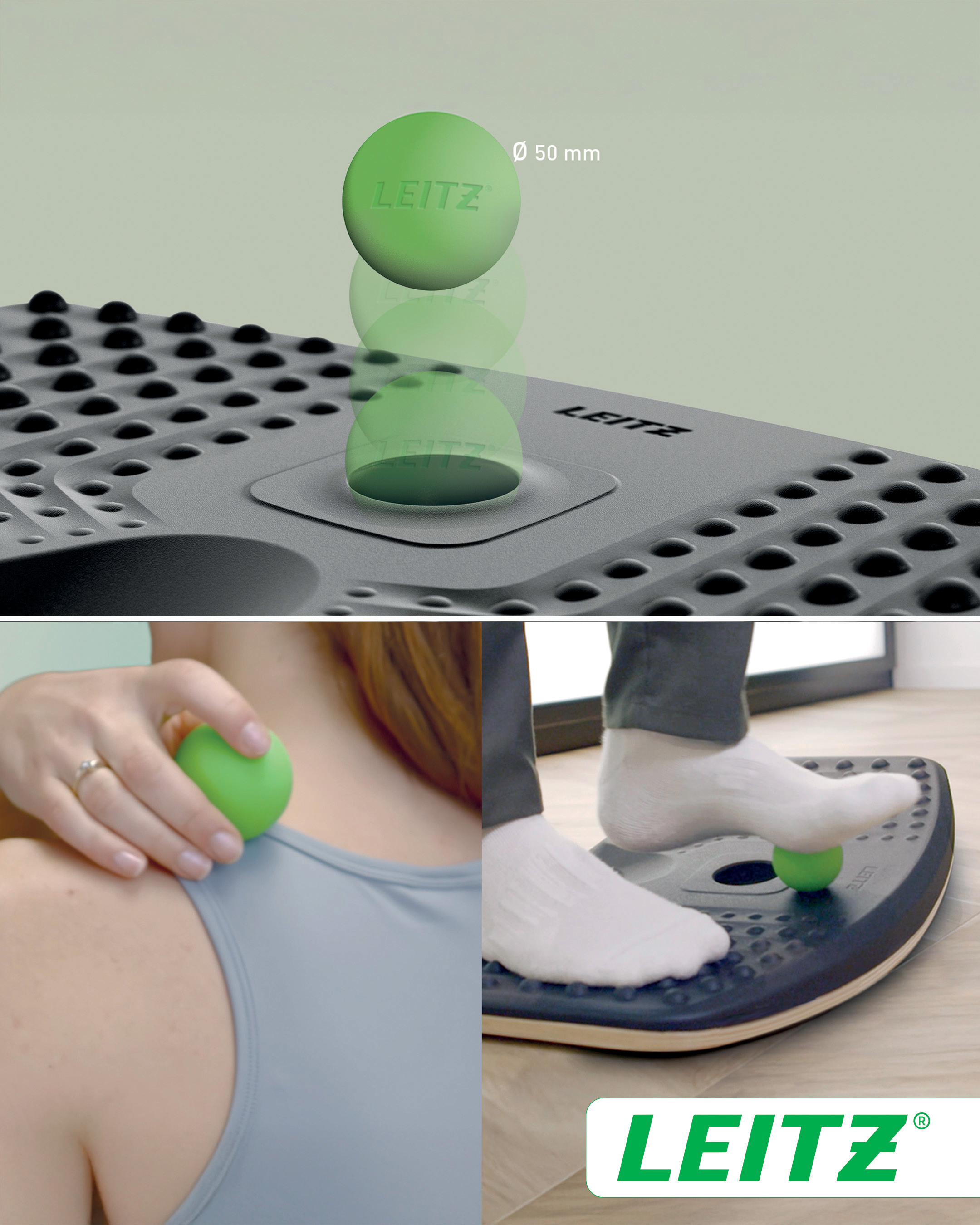 Restez en mouvement et sentez-vous bien avec la Leitz Ergo Balance Board. Améliorez votre posture, soulagez vos douleurs dorsales et augmentez votre niveau d'énergie grâce à l'innovante Leitz Ergo Balance Board. Cette planche branlante de haute qualité a été conçue pour les bureaux debout et dispose d'une inclinaison équilibrée de 14° qui favorise les micro-mouvements naturels et aide à activer le centre de votre corps et vos jambes pendant le travail. L'utilisation régulière de cette planche d'équilibre qui ménage les articulations peut renforcer les muscles de votre tronc, améliorer votre équilibre et favoriser la circulation sanguine. Elle a été testée et certifiée par l'Institut allemand de la santé et de l'ergonomie (IGR). Il est idéal pour les longues stations debout ou assises et même pour les vidéoconférences, afin de réduire la fatigue des pieds, d'améliorer la posture et de vous maintenir en forme tout au long de la journée. La surface de massage structurée anti-fatigue soutient vos articulations et vos muscles, tandis que la balle de massage amovible offre un soulagement ciblé pour les pieds, les poignets et les épaules. La planche est basée sur un socle en bois durable, certifié FSC, avec un design antidérapant pour garantir la sécurité. Elle est compacte et facile à transporter et à ranger lorsqu'elle n'est pas utilisée. Il peut également être placé sous le bureau pour effectuer un mouvement de bascule apaisant lorsque vous êtes assis, afin que vos pieds restent actifs même si vous restez longtemps assis. Son style minimaliste s'intègre parfaitement à la maison, au bureau ou à la salle de sport, et la poignée en aluminium intégrée facilite le transport et le rangement. Augmentez votre productivité, votre confort et votre bien-être général avec Leitz. Notre mission est de proposer des solutions qui permettent à chacun de réussir et de se sentir bien au travail et au-delà.