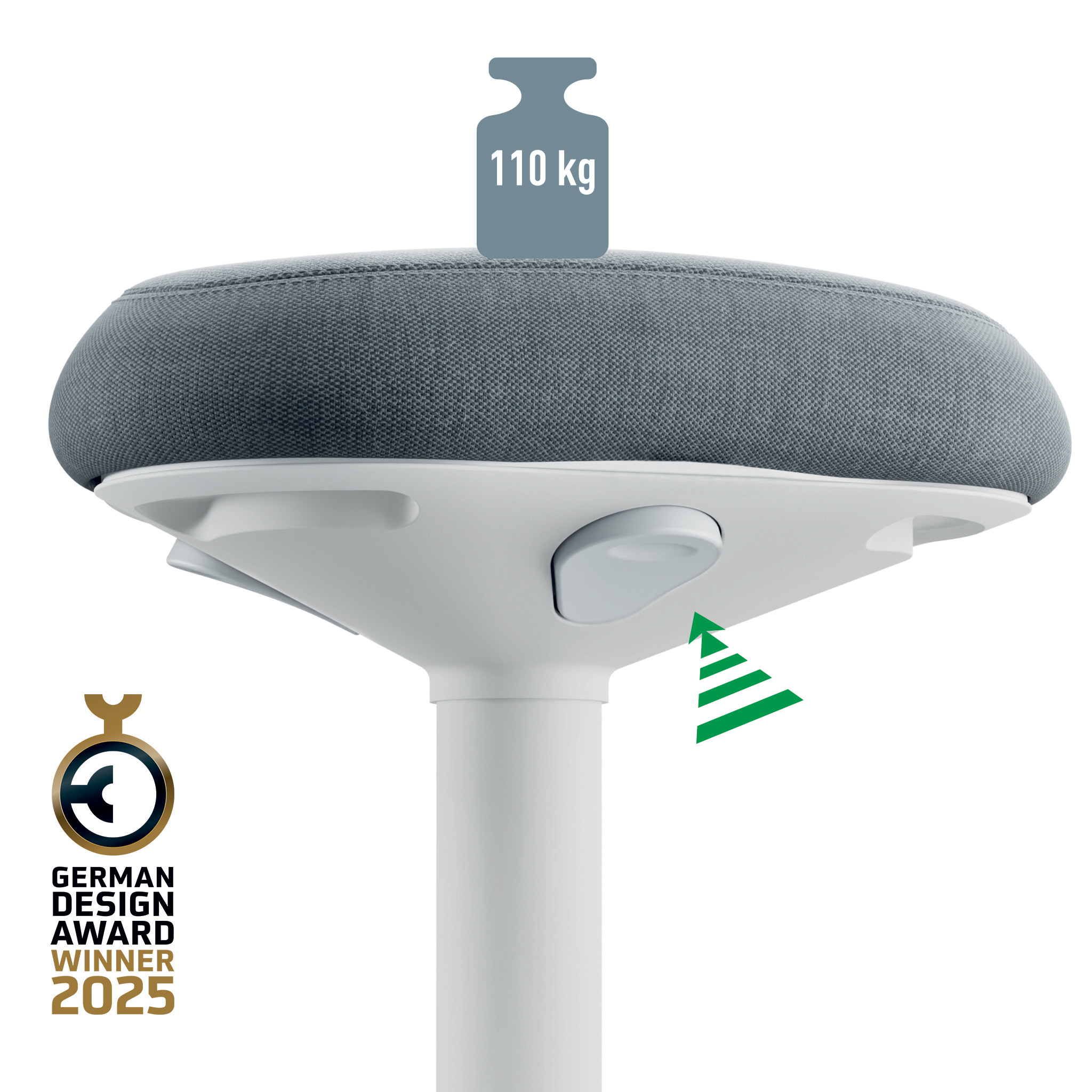 Le tabouret de bar Leitz Ergo Active est doté d'une assise confortable unique en mousse à double densité (DDF) avec un noyau de soutien ergonomique fixe. Comme pour un tabouret de selle, la forme triangulaire répartit uniformément le poids sur le bassin. Grâce au rembourrage en mousse particulièrement souple autour du noyau de soutien, la pression sur les cuisses et les jambes est réduite. La surface d'assise de 9 cm d'épaisseur est conçue pour le confort et peut être utilisée aussi bien comme appui pour se tenir debout en s'appuyant dessus que pour s'asseoir, ce qui incite à se tenir plus droit et offre une expérience d'assise extrêmement confortable similaire à celle d'un coussin d'assise. Développé en collaboration avec l'institut allemand IGR, l'institut pour la santé et l'ergonomie, ce tabouret de bureau ergonomique à hauteur réglable a été conçu pour vous permettre de rester actif à la maison ou au travail sur un bureau assis-debout, sur des tables de réunion hautes ou sur votre table de cuisine. Le pied de socle arrondi du tabouret de bureau debout incite à un mouvement actif et à une assise dynamique, car il se balance et pivote pendant le travail. Cela renforce le dos et le centre du corps et prévient les douleurs. Réglage en hauteur aisé et simple de 25 cm (57 - 82 cm) en appuyant sur le bouton situé sous l'assise afin de régler la hauteur parfaite. Le revêtement du siège est composé à 100 % de matériaux recyclés et la surface antidérapante en caoutchouc du socle empêche le tabouret de glisser tout en protégeant vos sols. Grâce à son poids léger et à la poignée de transport située sous l'assise, le tabouret ergonomique assis-debout est facile à transporter d'une pièce à l'autre et peut être facilement rangé sous un bureau. Ce tabouret assis-debout moderne et minimaliste est idéal à la maison ou au bureau pour améliorer le confort et maximiser la productivité. Notre mission est de proposer des solutions qui permettent à chacun de réussir et de se sentir bien au travail et au-delà. Combinez le tabouret assis-debout réglable en hauteur avec de nombreux autres produits Leitz Ergo pour créer un espace de travail flexible qui vous permet d'alterner régulièrement entre la position assise, la position debout et le déplacement. Restez actif - FEEL GOOD avec Leitz.