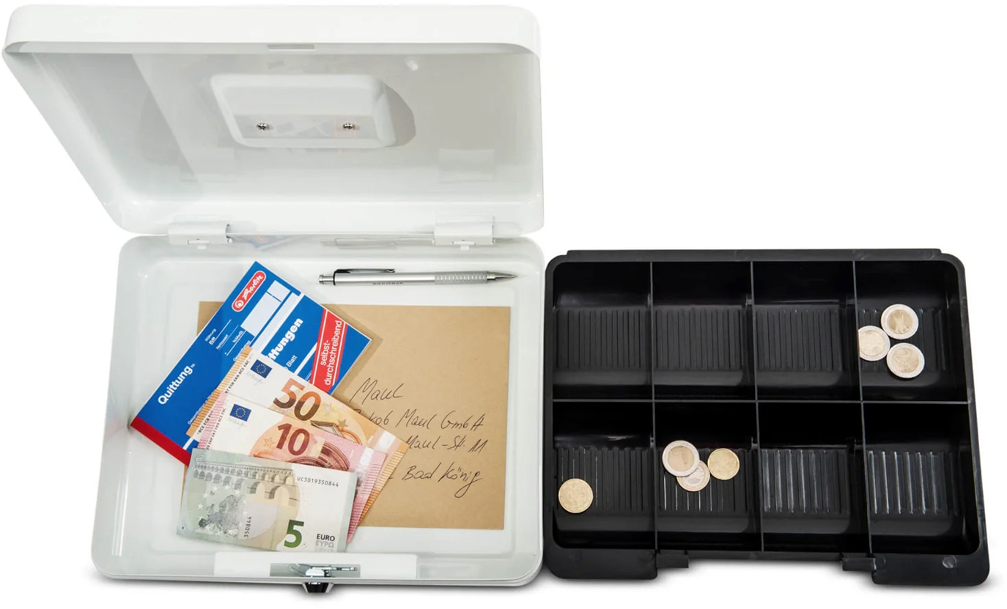 Le coffret à monnaie de MAUL est en acier laqué avec insert à pièces en plastique. La serrure à cylindre garantit la sécurité de votre argent.