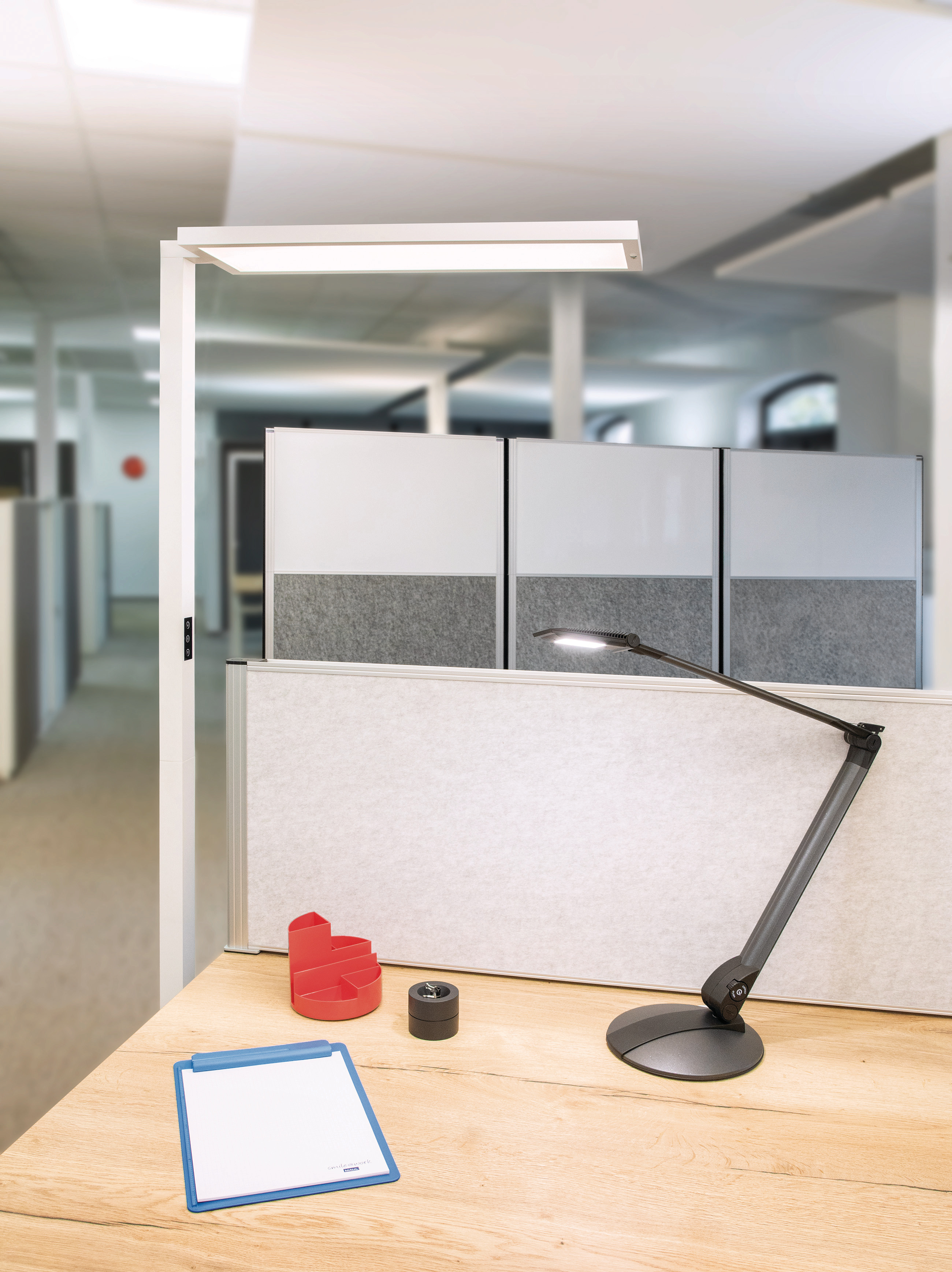Luminaire design en aluminium très performant avec gestion moderne de l'éclairage. Régulation constante de la lumière grâce à un capteur de mouvement et de lumière du jour. Température de couleur et intensité lumineuse (variateur) réglables en continu. Grande tête de lampe : pour les postes de travail doubles & lumière sur toute la surface de la table. Commande séparée : Lumière directe pour le plan de travail et indirecte pour l'éclairage de la pièce, rayonnement vers le haut 80 % et vers le bas 20 %. Haute efficacité énergétique, technique LED moderne. Label GS, concept de sécurité technique Made by MAUL. Designed by MAUL : développé et construit en Allemagne. Détecteur de mouvement : diminue automatiquement l'intensité lumineuse après 30 min. et s'éteint après 30 min. supplémentaires sans détection de mouvement. Capteur de lumière du jour : la lumière émise par le luminaire varie en fonction du niveau d'éclairage. Colonne et tête en aluminium de haute qualité. Grande tête de lampe : dépasse de 80 cm au-dessus du bureau. Tête de lampe fermée. Pratique : diffuseur pour une ombre réduite. Consommation électrique nulle lorsque le luminaire est éteint grâce à l'interrupteur marche/arrêt. Remplacement de la source lumineuse et de l'appareillage possible par un électricien qualifié. Emballage recyclable. Intensité lumineuse du luminaire : 940 lux à une distance de 85 cm, 580 lux à une distance de 110 cm, température de couleur (par source lumineuse):2.700 Kelvin (blanc chaud) à 5.700 Kelvin (blanc lumière du jour), Nombre de sources lumineuses:2 , Classe d'efficacité énergétique (par source lumineuse):Indirecte : C (spectre A à G) & Directe : D (spectre A à G), Consommation d'énergie pondérée (par source lumineuse):87 kWh/1000 h (69 kWh/1000 h & 18 kWh/1000 h), Durée de vie L70B50 (par source lumineuse):50.000 h, Flux lumineux utile (par source lumineuse):15.150 lumens (12.500 lumens & 2.650 lumens), Matériaux:Tête : aluminium, métal - Colonne : aluminium, métal, Dimensions:Tête : 79.2 x 24 x 3.1 cm, Mouvement:Tête : fixe Pied stable et massif en acier, 27 x 45,5 cm. Ne gêne pas : le pied découpé peut être positionné autour d'un pied de table. Hauteur : 196 cm.