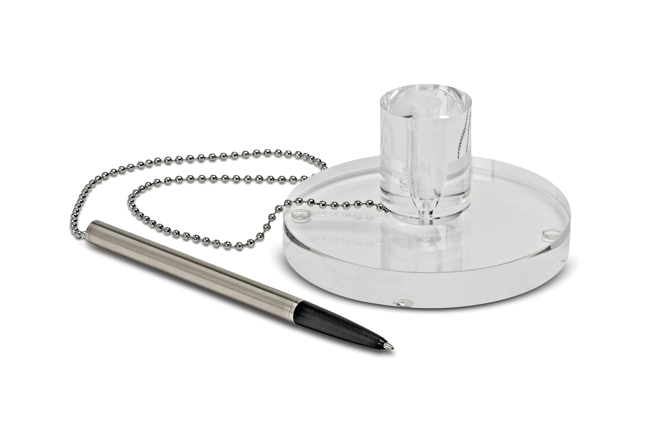 Harmonieux dans tout environnement de bureau. Stylo à bille noble en acier inoxydable et plastique sur une chaîne à bille solide. Pour les guichets et les bureaux ouverts au public, dans les banques et les administrations. Fabriqué en Allemagne. Tenue sûre et stable. Mine indélébile. Mine interchangeable, type G2, ISO 12757/2. Couleur d'écriture noire. Pied lourd en acrylique de haute qualité pour une bonne stabilité. Picots transparents sur le socle. Chaîne à bille solide, longueur 42 cm.