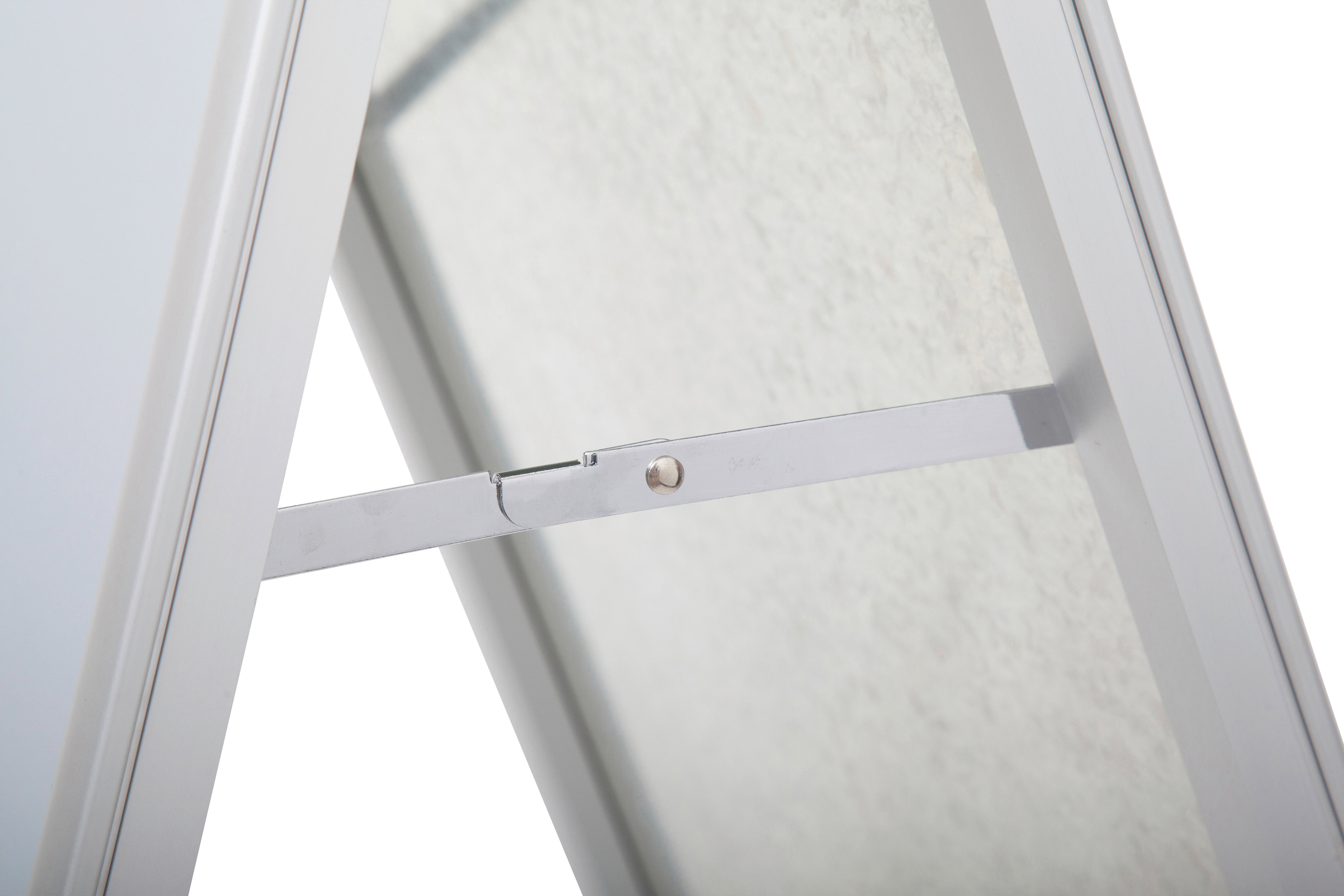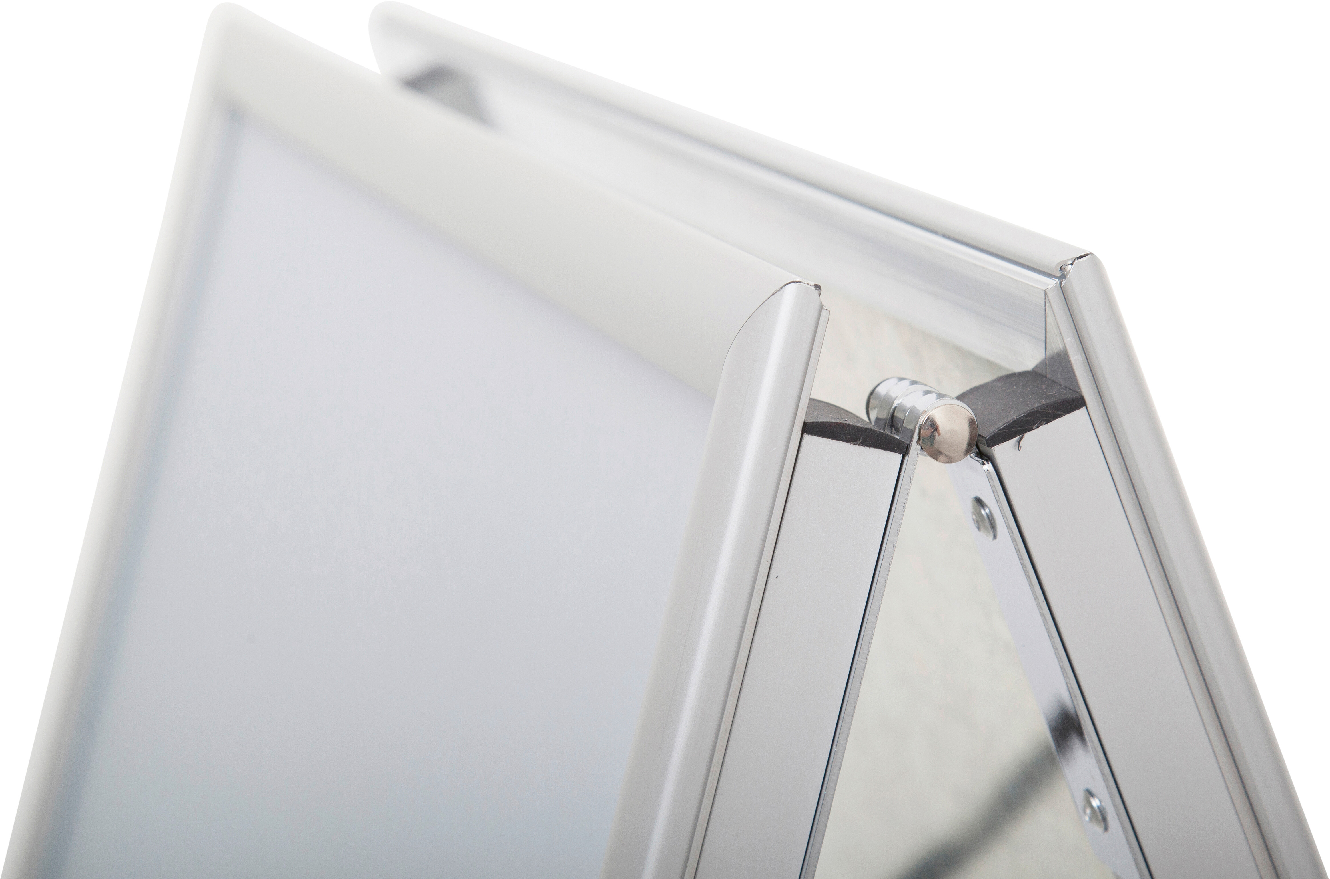 Tréteau d´affichage double face, idéal pour la présentation professionnelle d’informations, d’affiches, de posters à l’intérieur comme à l’extérieur et résistant aux intempéries. Changement et insertion du contenu faciles par l’avant: ouvrir le cadre, retirer le film de protection, déposer l’affiche et la protection, rabattre le cadre et le tour est joué. Le film de protection antireflet stabilisé aux UV évite la décoloration. Le cadre est constitué d’un profilé d'aluminium anodisé gris (32 mm). Les parois arrière sont en inox galvanisé à chaud et leur poids assure une grande stabilité.