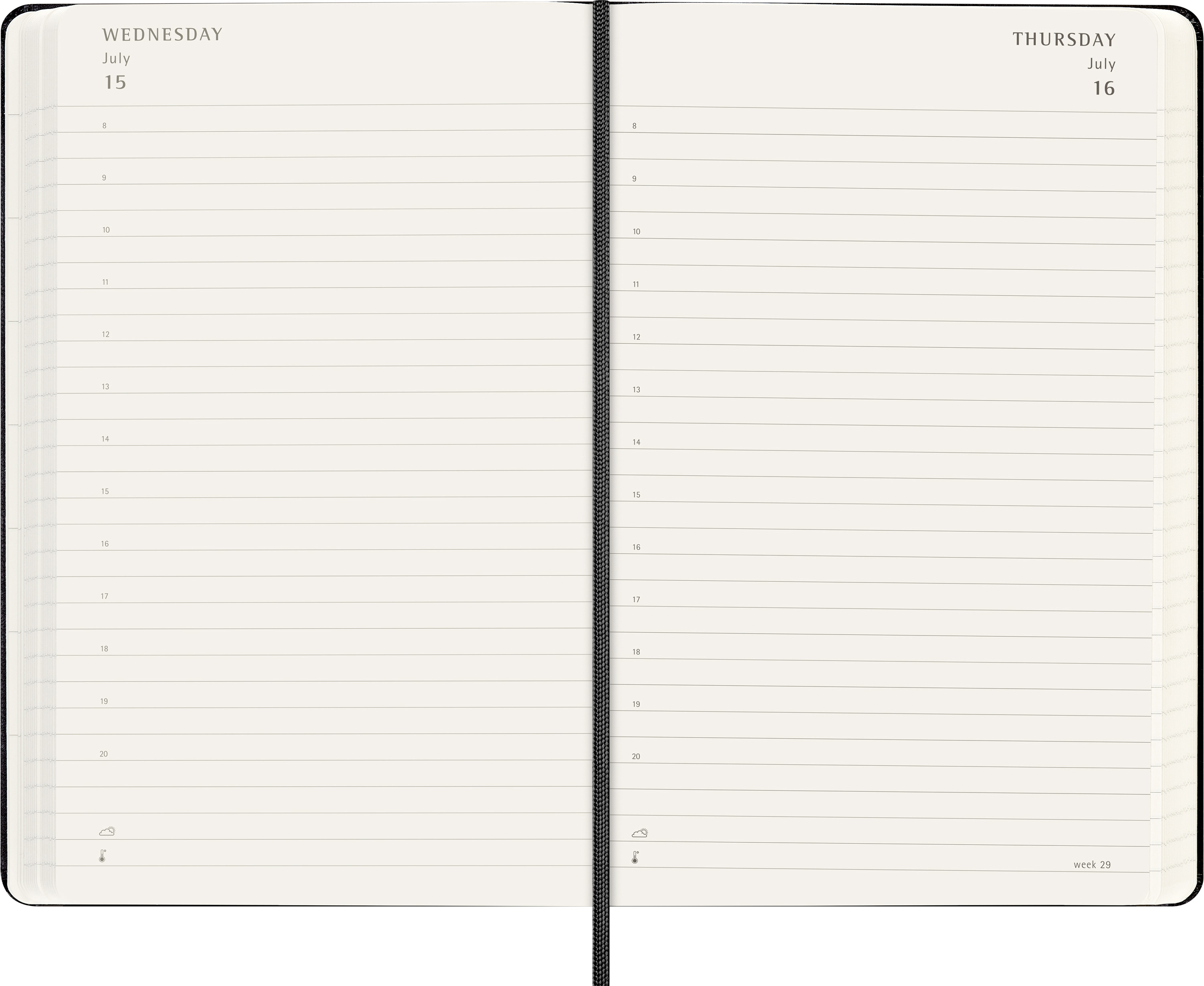 L'agenda journalier Moleskine est daté de juillet à décembre. Ce calendrier très apprécié, avec sa propre page par jour, est disponible dans toute la palette de couleurs pour consigner chaque jour de l'année en détail.