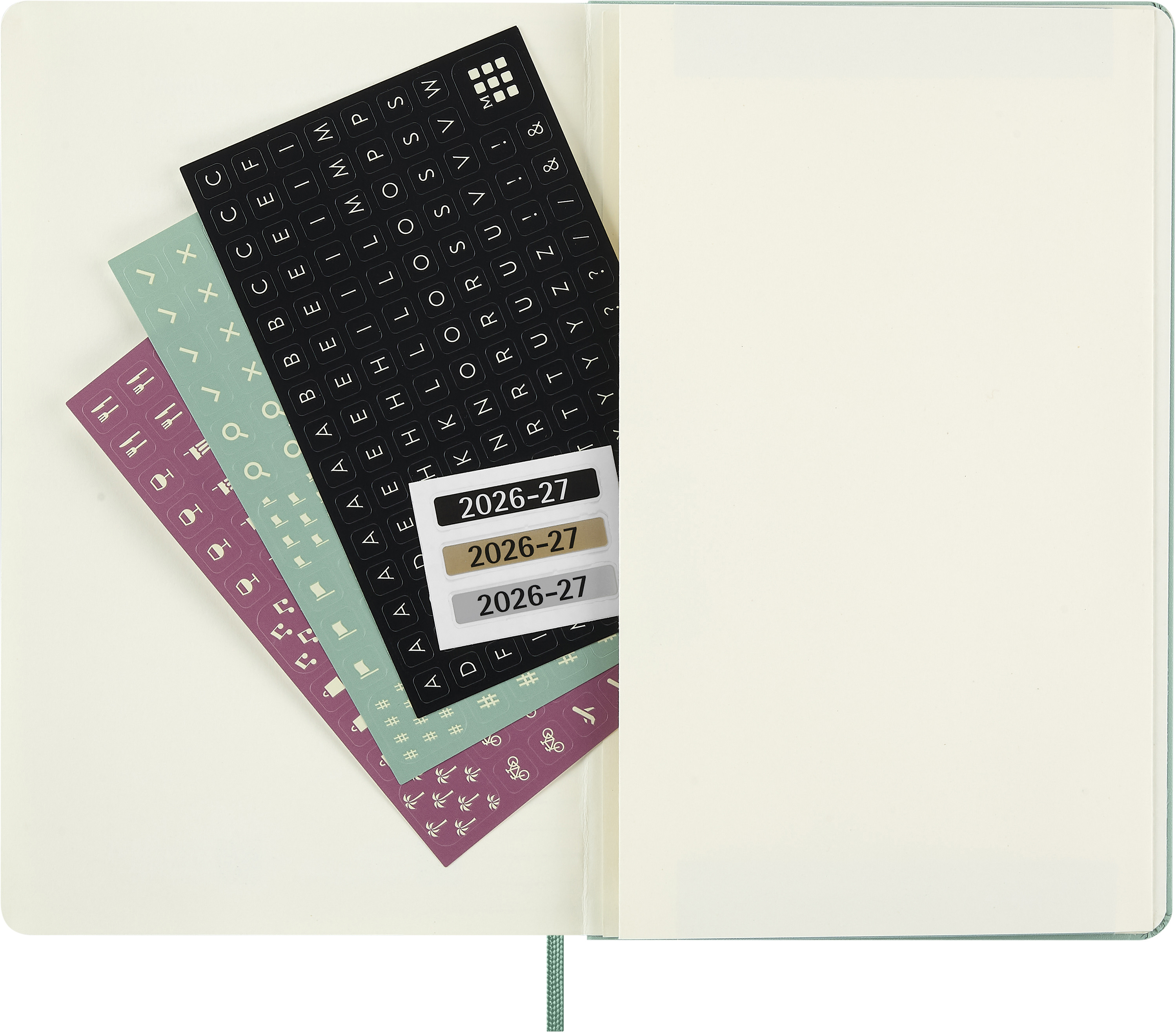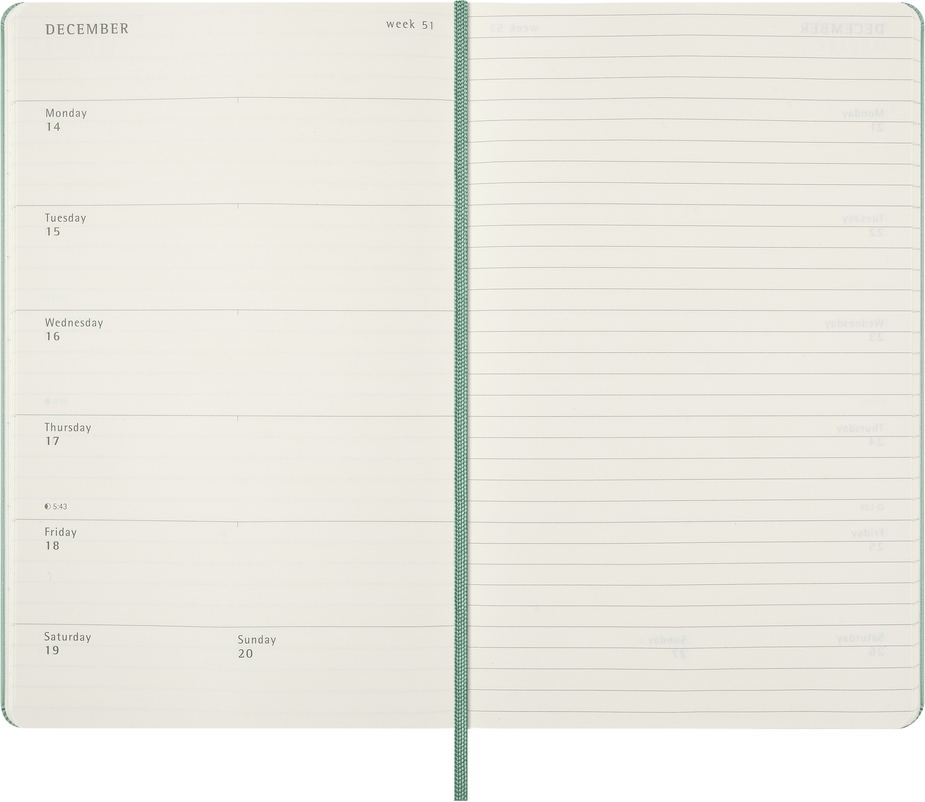 L'agenda hebdomadaire 18 mois de Moleskine va de juillet à décembre. Avec les rendez-vous de la semaine sur la page de gauche et une page lignée à droite avec de la place pour les notes et les idées, ce type de calendrier très apprécié est parfait pour les étudiants, les enseignants et les hommes d'affaires.