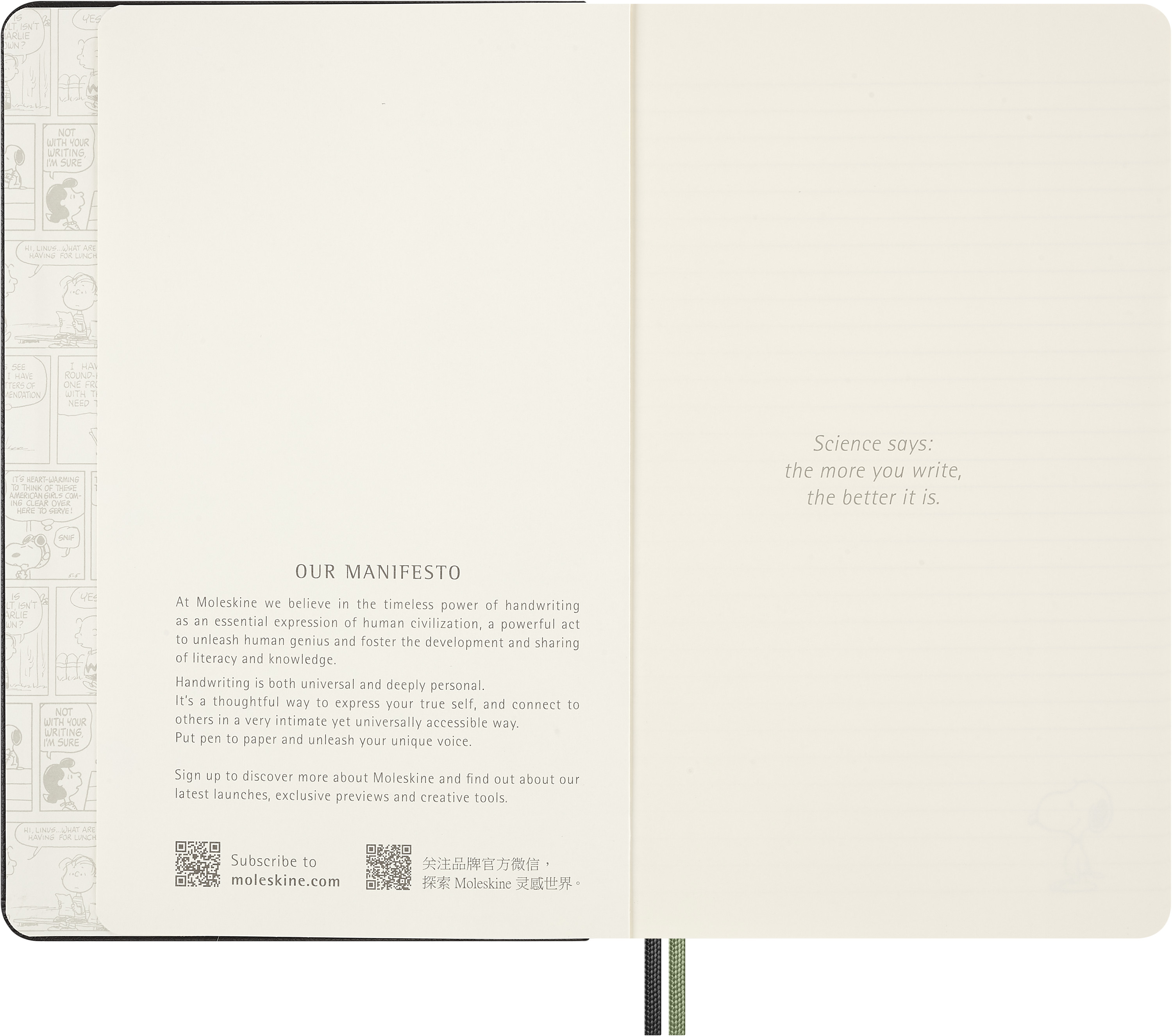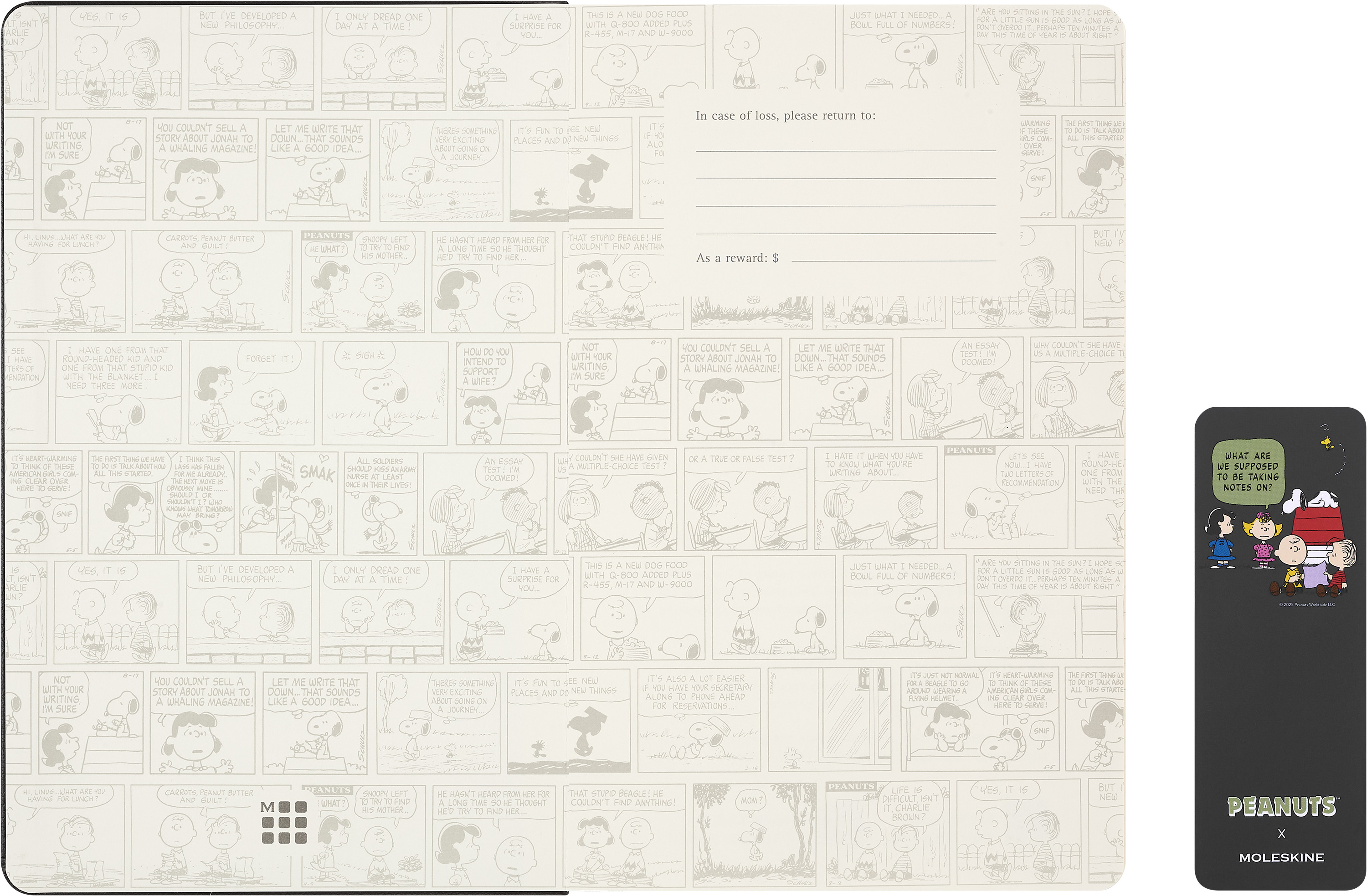 Exprimez vos pensées, vos projets et vos idées dans ce carnet Peanuts x Moleskine : un hommage aux vérités intemporelles et à la magie de l'écriture manuelle. Ce carnet ligné au format Large présente les illustrations populaires de Peanuts et une citation célébrant le plaisir d'écrire et de prendre des notes.Soigneusement fini, il allie créativité et fonctionnalité et est équipé d'autocollants Peanuts, d'un marque-page en papier et de pages de garde assorties. La couverture rigide, la fermeture par élastique et les deux liens du marque-page garantissent que vos notes sont protégées et bien organisées. Avec son papier blanc ivoire sans acide (100 g/m²), le carnet de notes s'ouvre à plat à 180° pour permettre d'écrire sans effort. L'avis iconique "In case of loss" sur la page de garde avant et la poche interne pliable à l'arrière complètent le look classique de Moleskine.Ce carnet de Moleskine incarne non seulement le charme inaltérable des Peanuts, mais souligne également les avantages cognitifs avérés de l'écriture manuelle : la pensée est aiguisée et l'activité cérébrale stimulée. Laissez-vous inspirer par Peanuts et Moleskine, d'une histoire vraie à l'autre. Des histoires vraies. Écrivez la vôtre.