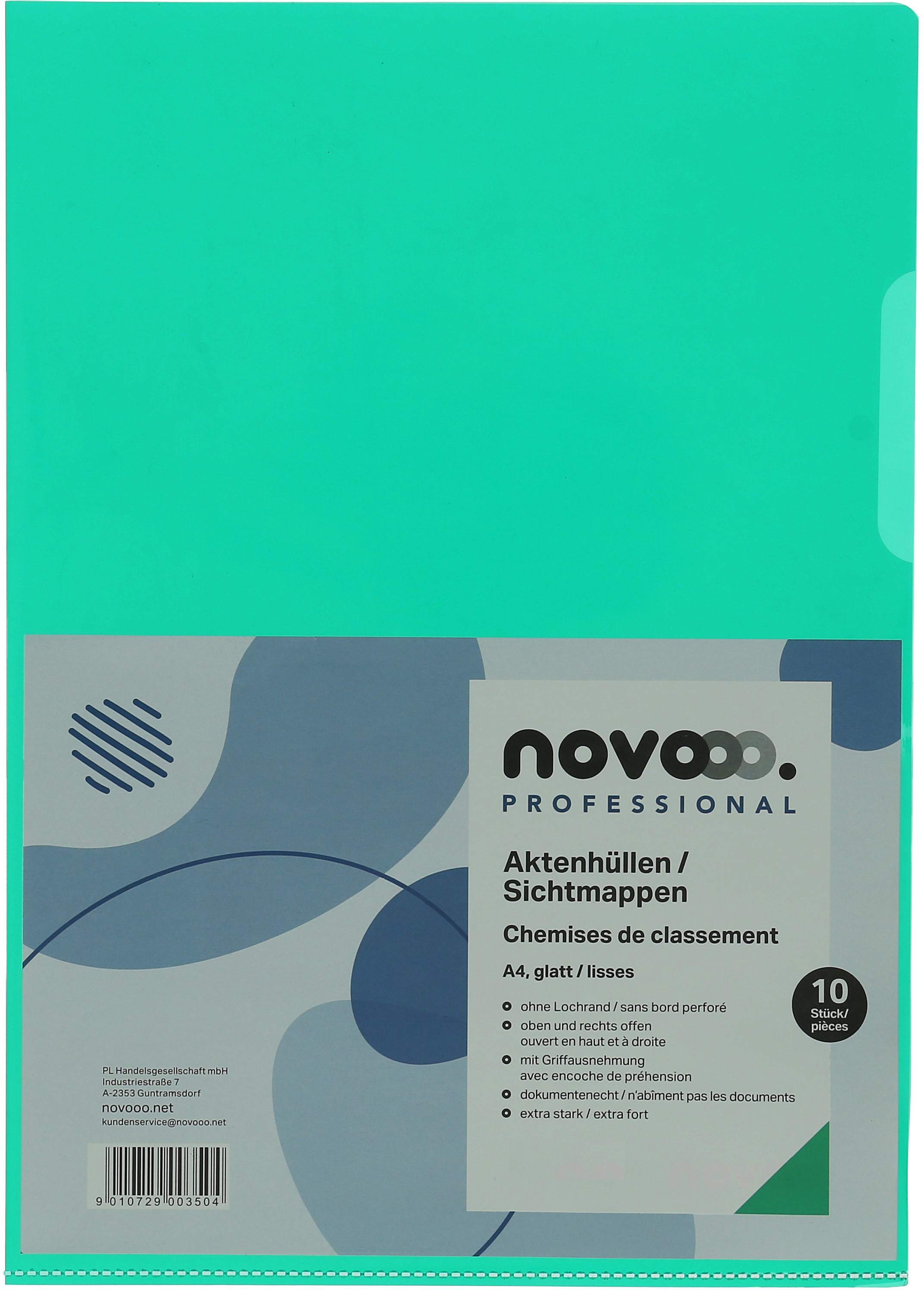 Les chemises transparentes NOVOOO sont fabriquées en polypropylène lisse d'une épaisseur de 140 µm. Les pochettes sont ouvertes en haut ainsi que sur le côté et ont une découpe de préhension pour faciliter le retrait. Les pochettes au format A4 permettent de conserver des documents.