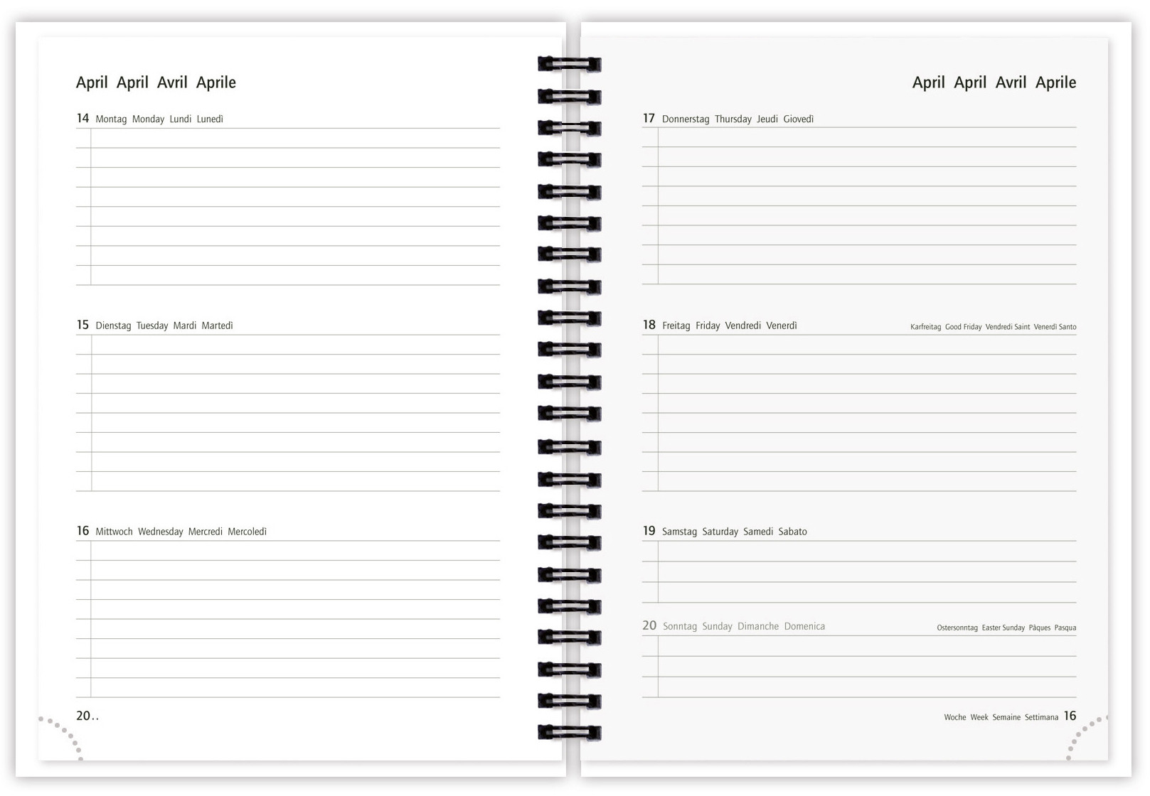 L'agenda scolaire durable Ecoline avec une couverture en carton recyclé et un contenu en papier recyclé contient 160 pages, 1 semaine sur 2 pages avec une impression en 4 langues : allemand, anglais, français & italien. Un supplément pratique est une liste de notes et un emploi du temps. Grâce à la reliure à spirale Twin-Wire, l'agenda scolaire est durable et agréable à utiliser.