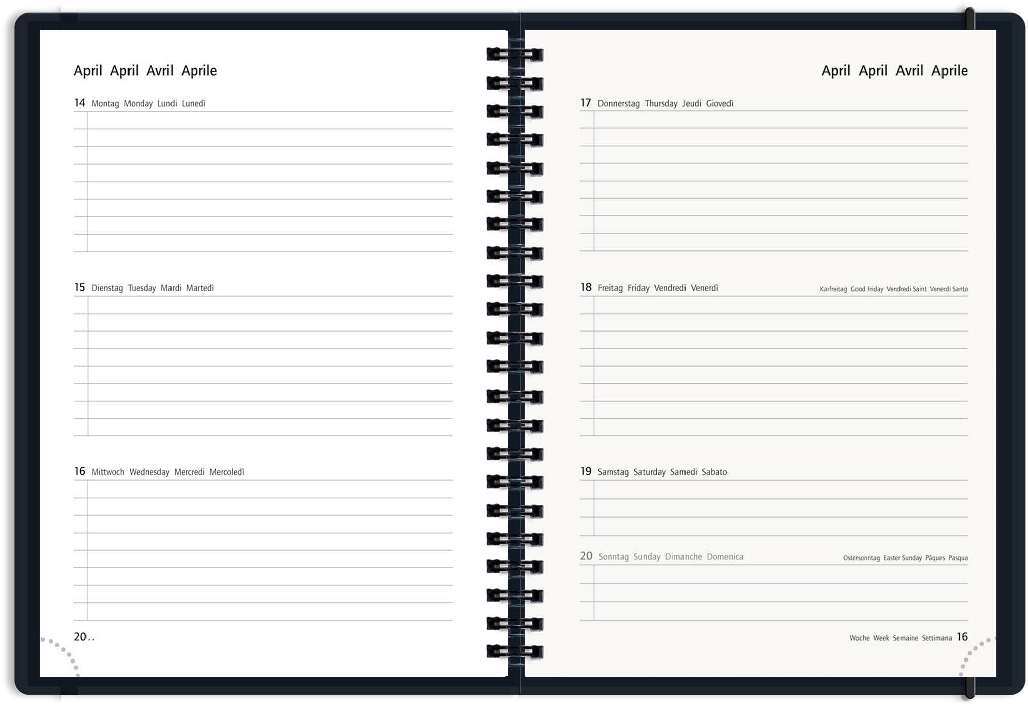 L'agenda scolaire MustHave a une couverture en PP durable et une fermeture à élastique. L'agenda contient 160 pages, 1 semaine sur 2 pages avec une impression en 4 langues : allemand, anglais, français & italien. Comme extra pratique, on y trouve une liste de notes, un emploi du temps, des pages d'adresses & de notes, des formules mathématiques et les vacances scolaires suisses. Grâce à la reliure à spirale Twin-Wire, l'agenda scolaire est agréable à utiliser.