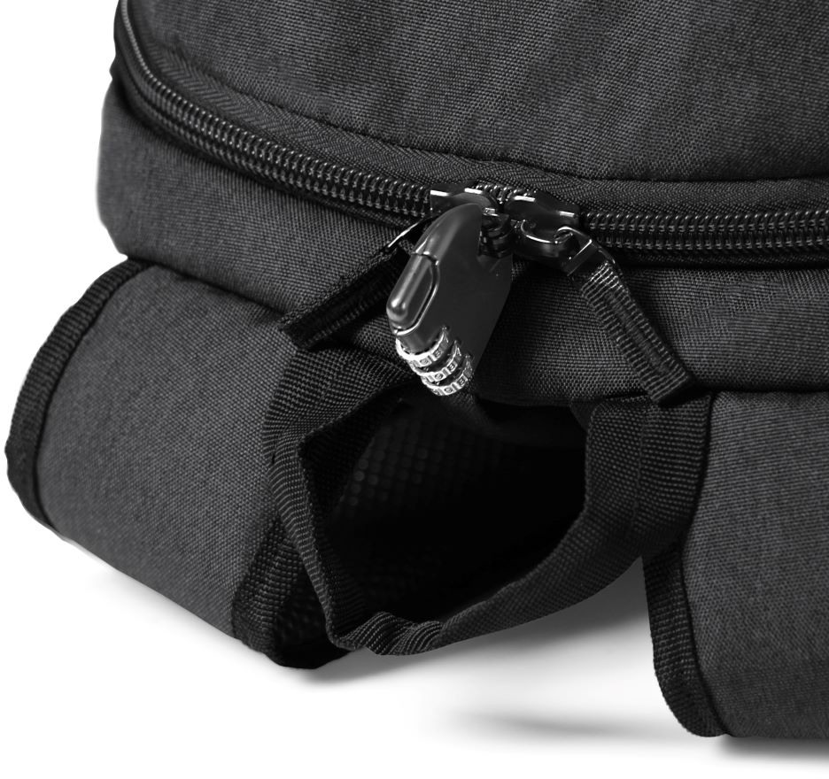 • 3 poches latérales en filet pour un parapluie et une bouteille d'eau
