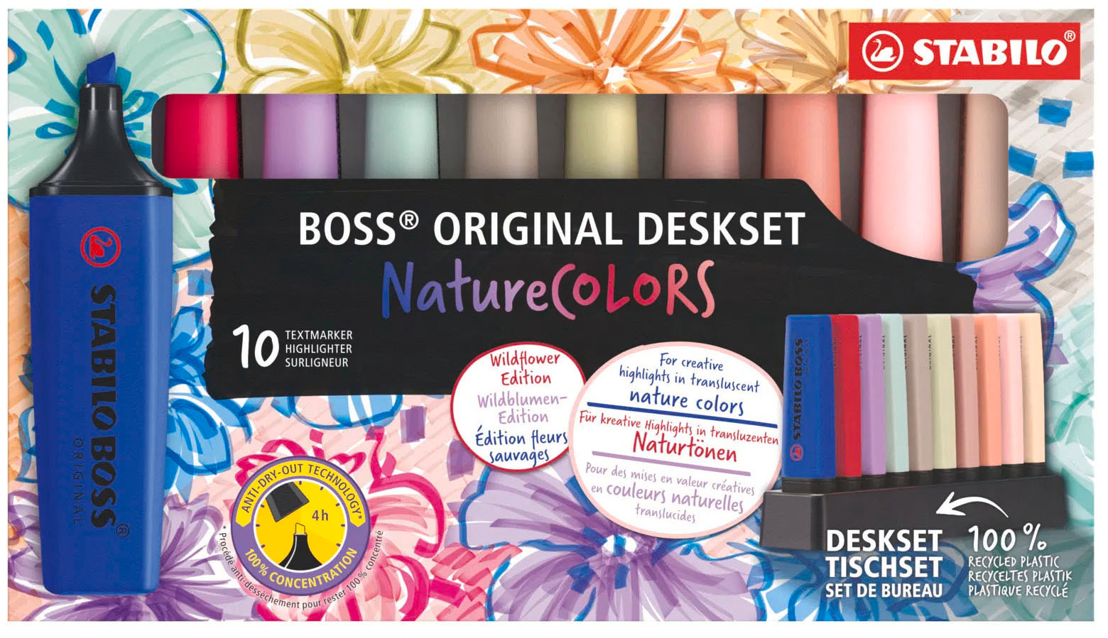 Le STABILO BOSS ORIGINAL NatureCOLORS Wildflower Edition ne convainc pas seulement par ses couleurs voyantes, mais aussi par ses propriétés qui favorisent la productivité et la créativité.