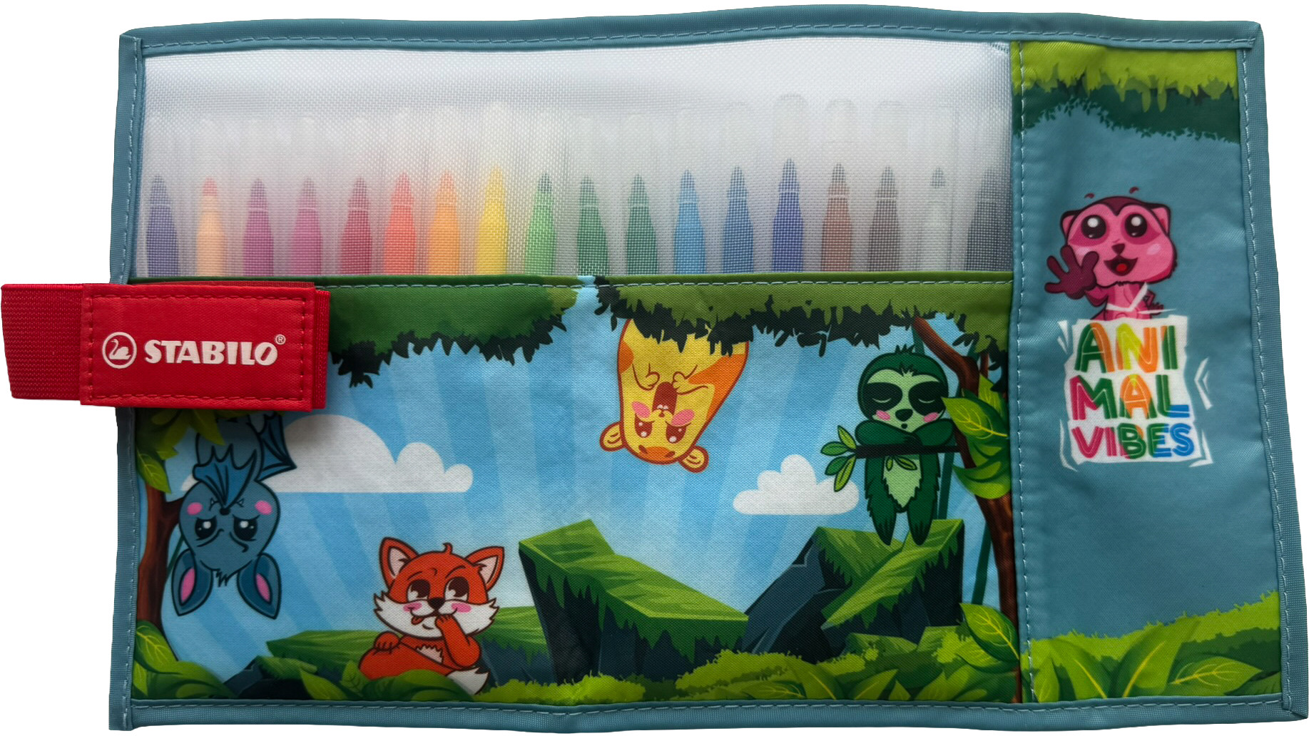 La collection STABILO Animal Vibes comprend des versions colorées et ludiques de produits STABILO populaires en édition limitée. Ce set de rollers au design Animal Vibes dans la couleur principale bleue contient 18 pcs. de feutres de coloriage STABILO power. Les feutres peuvent rester ouverts jusqu'à 8 semaines sans pour autant se dessécher. C'est un avantage notamment lorsque les feutres de coloriage sont également utilisés par de jeunes enfants. En outre, l'encre des feutres est lavable - les petites taches ne sont donc pas un problème.
