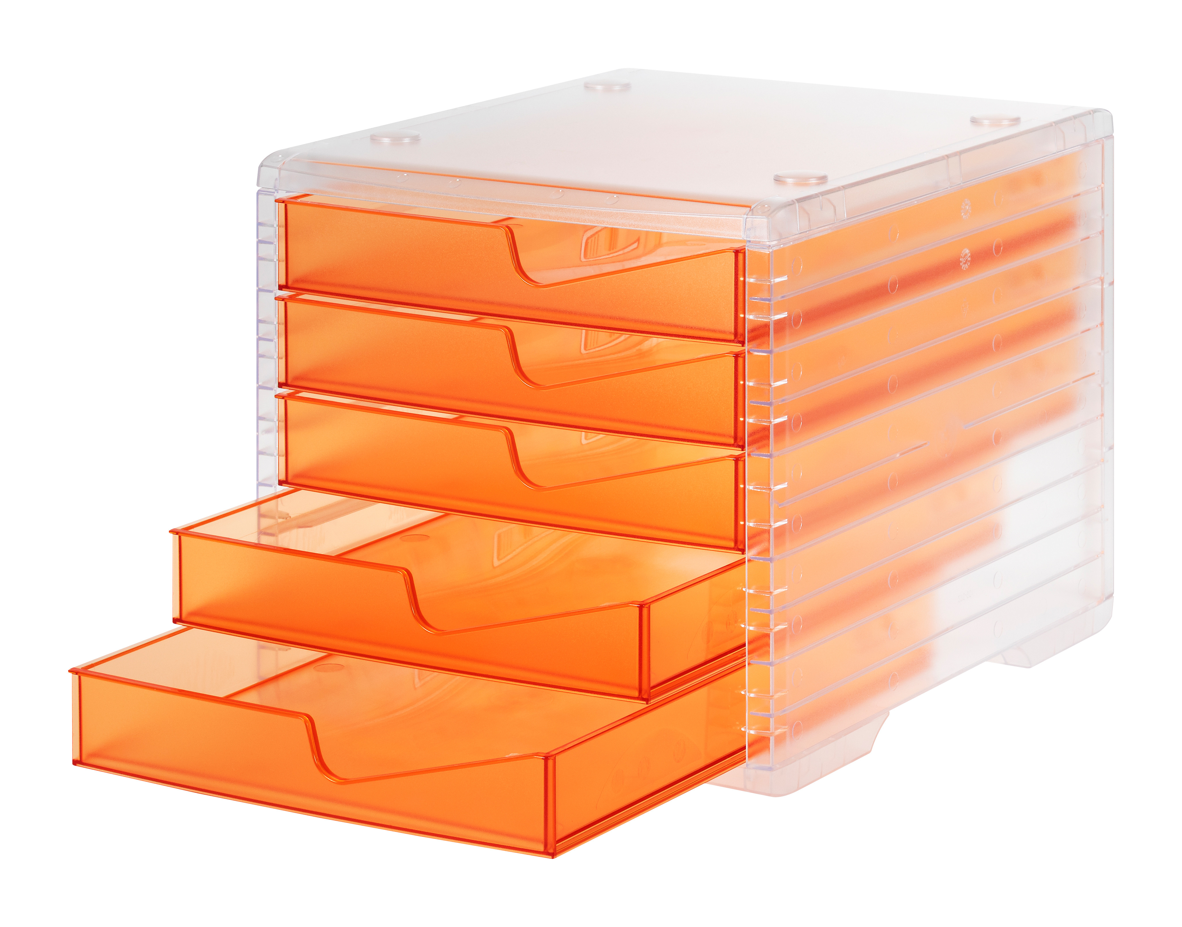 Boîte à tiroirs élégante et colorée en polystyrène résistant aux chocs. Pour des rangements jusqu'au format C4, empilable sans pièces de jonction. Le boîtier transparent laisse transparaître en douceur les couleurs translucides des tiroirs. Tiroirs avec arrêt de tiroir pratique. En outre, les tiroirs peuvent être retirés grâce aux butées de tiroir desserrées.
