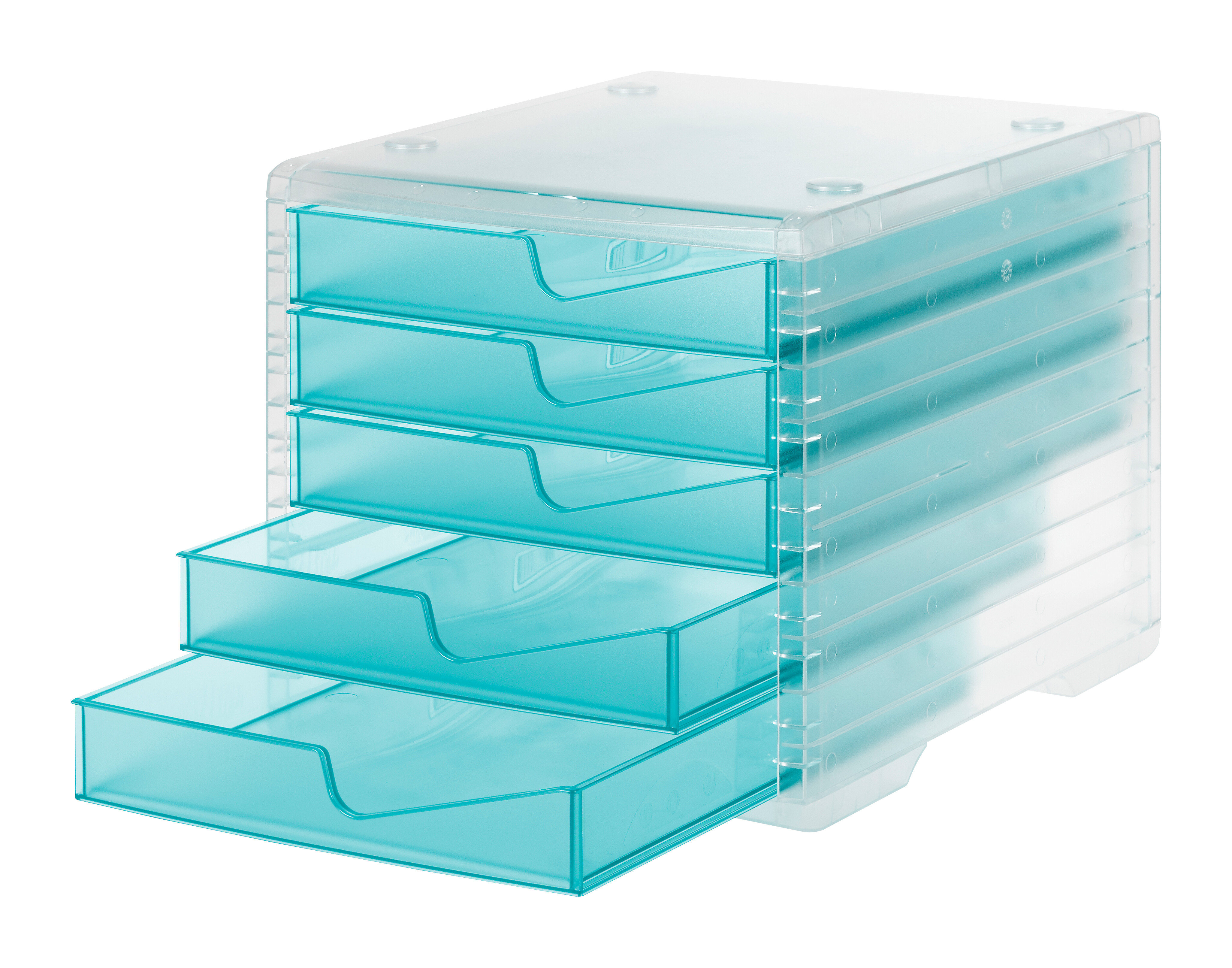 Boîte à tiroirs élégante et colorée en polystyrène résistant aux chocs. Pour des rangements jusqu'au format C4, empilable sans pièces de jonction. Le boîtier transparent laisse transparaître en douceur les couleurs translucides des tiroirs. Tiroirs avec arrêt de tiroir pratique. En outre, les tiroirs peuvent être retirés grâce aux butées de tiroir desserrées. Dimensions : L 270 x P 340 x H 255 mm. Boîtier : transparent-translucide Tiroirs : aqua-translucide