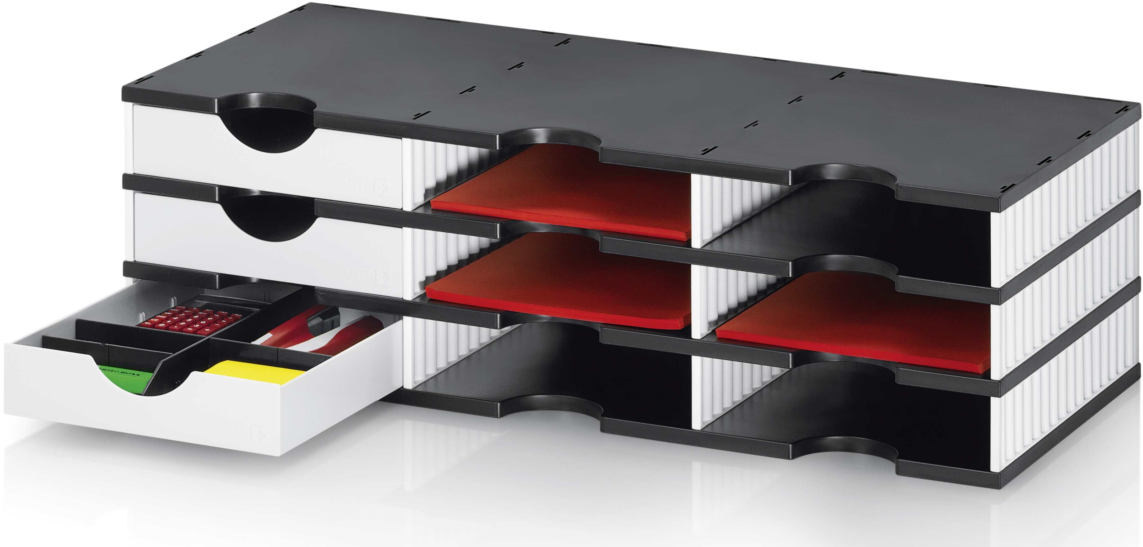 Le système de classement pratique Styro avec ses 6 compartiments et 3 tiroirs aide à maintenir l'ordre et permet d'accéder rapidement aux documents importants grâce aux zones de préhension. La station de tri Styrodoc Trio convient aux documents jusqu'au format C4. Ainsi, les papiers, les documents, les chemises transparentes ou les enveloppes peuvent être bien rangés et de manière claire. Le système de classement peut en outre être utilisé comme station de tri postal.