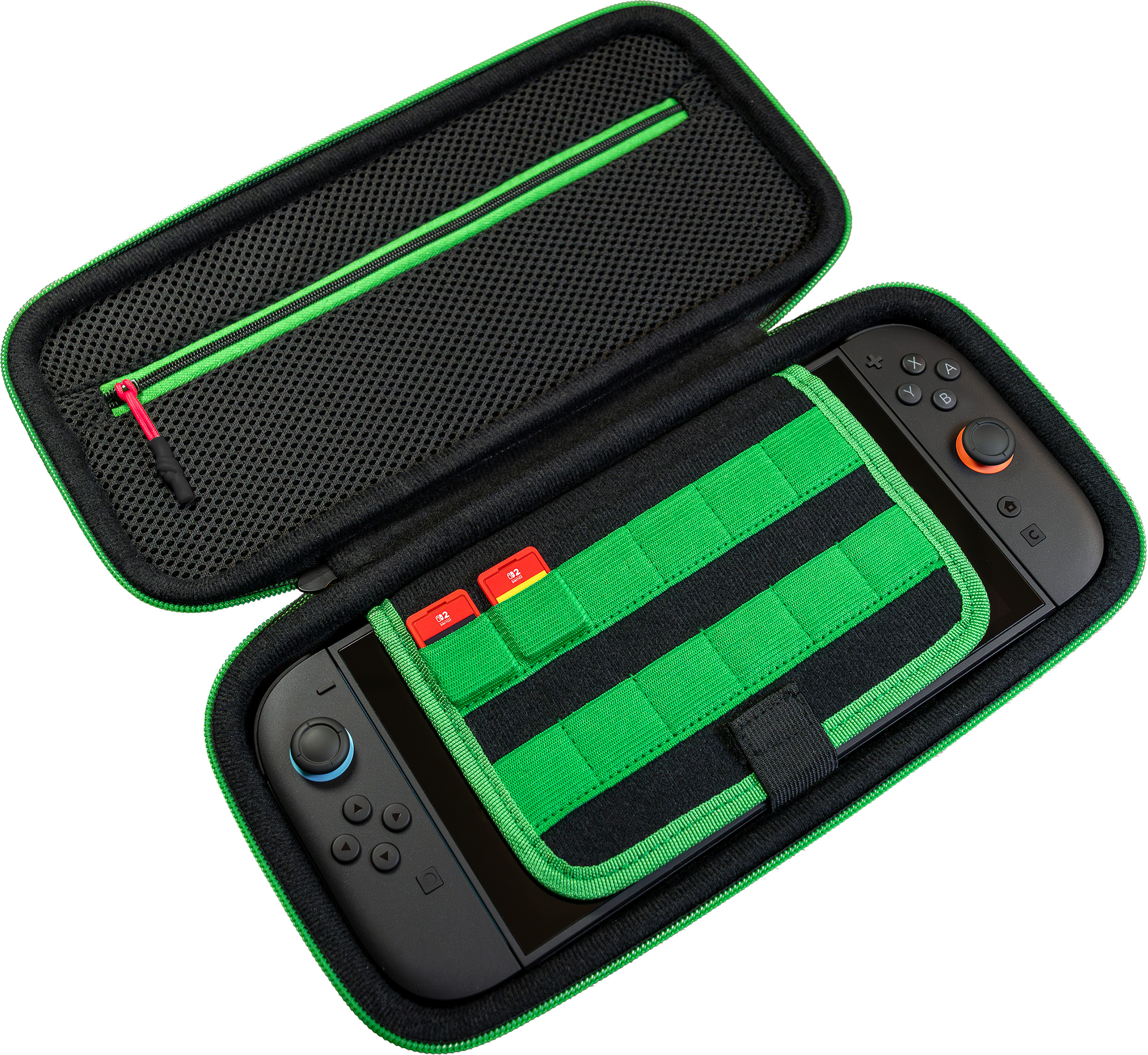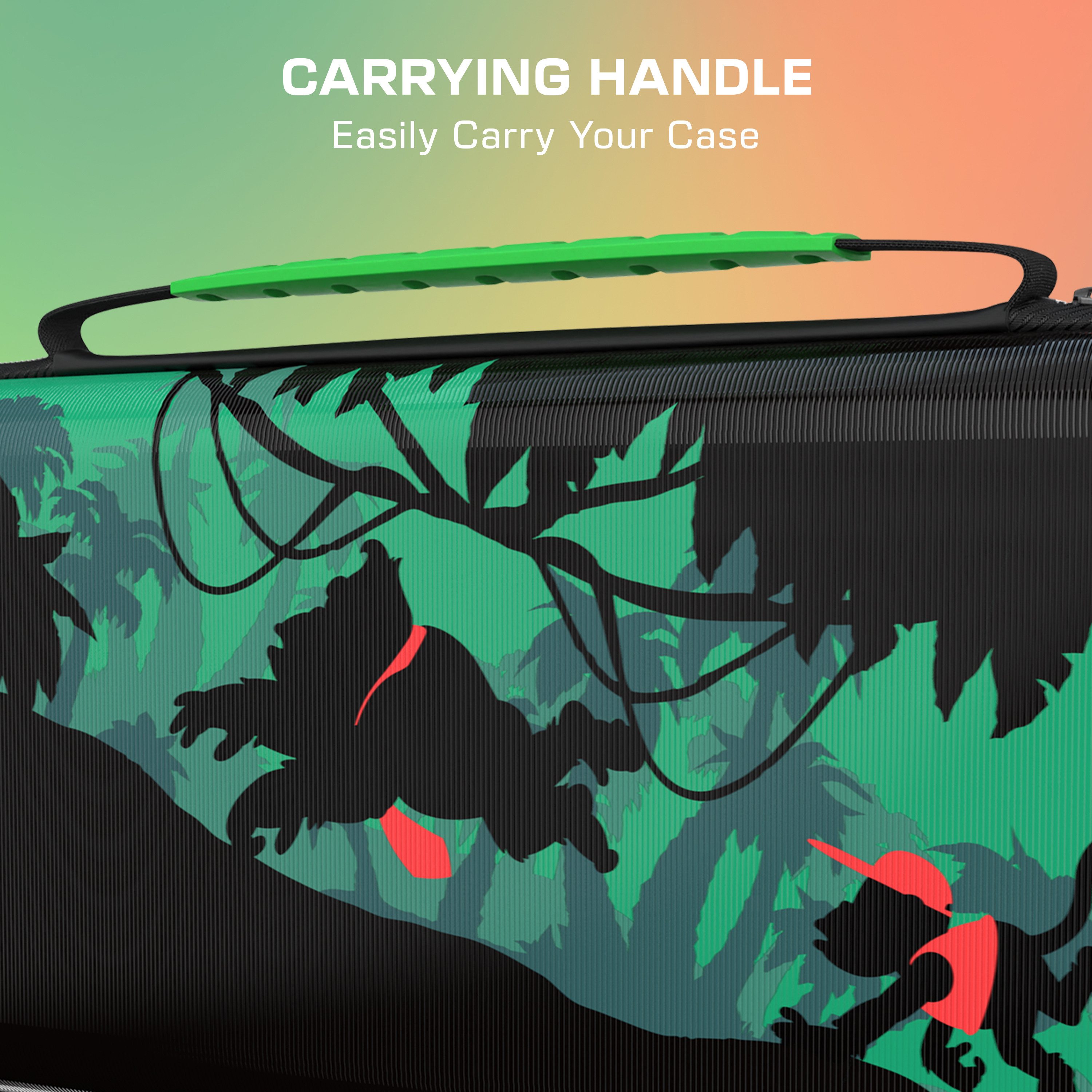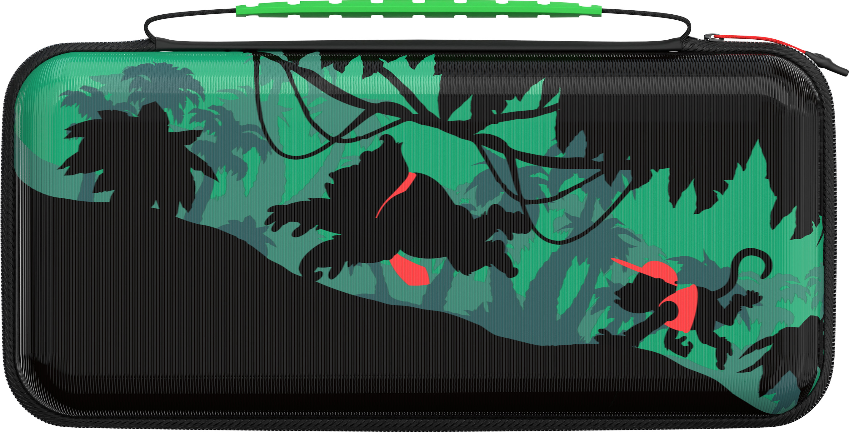 Avec l'étui de voyage PlayTrek™ sous licence officielle pour Nintendo Switch™ 2, tu peux voyager en toute confiance. Cette édition Donkey Kong a un design lenticulaire sympa qui montre des scènes animées lorsque tu bouges l'étui. Également compatible avec la Nintendo Switch™ et la Nintendo Switch™ - modèle OLED, cet étui robuste est doté d'une coque moulée en EVA très résistante et d'une housse extérieure en polyester recouverte de TPU pour une protection supplémentaire. Le rabat rembourré protège ton écran et sert également de support pour les cartes de jeu, tandis qu'une poche en filet permet de ranger les accessoires de manière ordonnée. L'étui est très pratique à emporter et dispose d'une poignée de transport confortable pour que tu puisses jouer en déplacement.