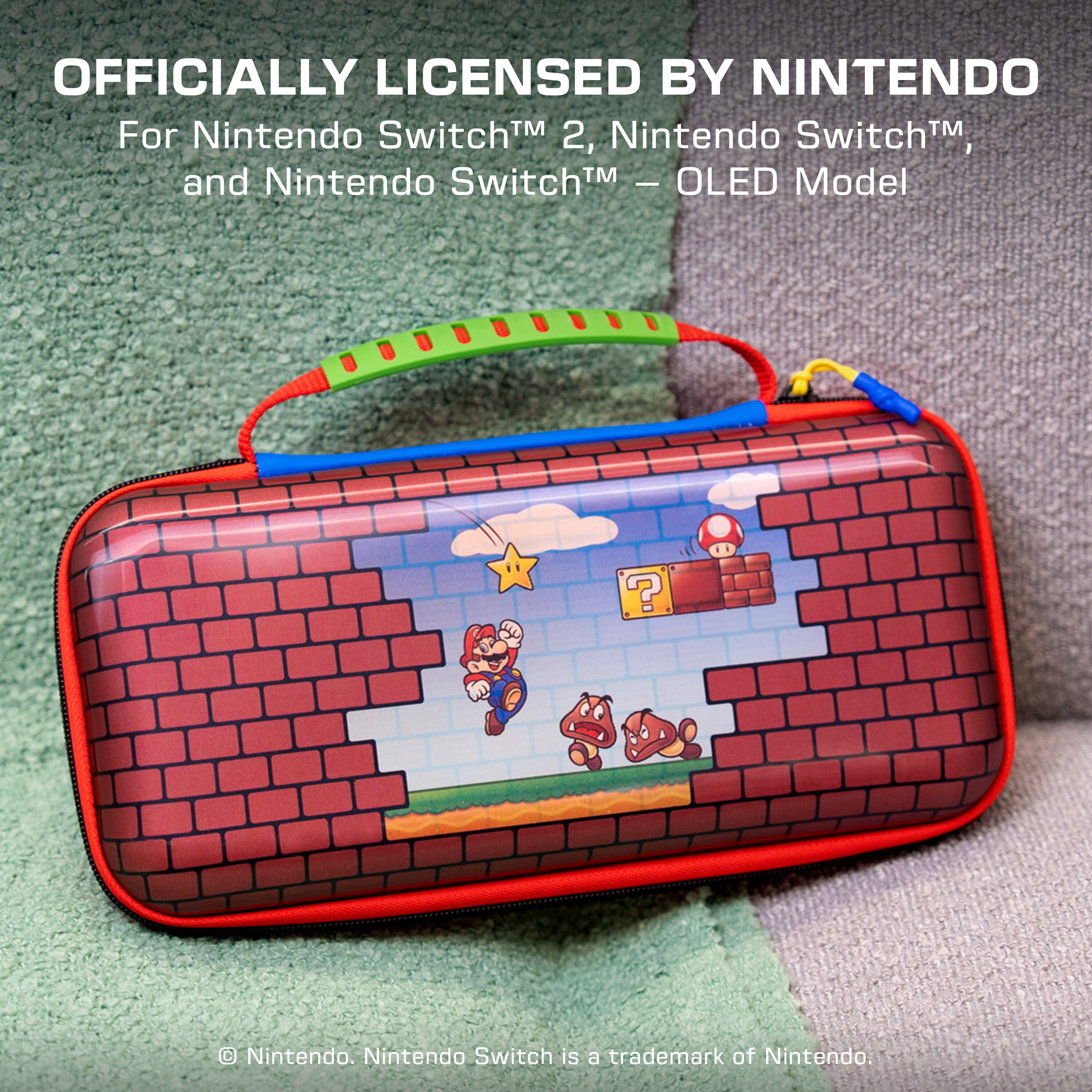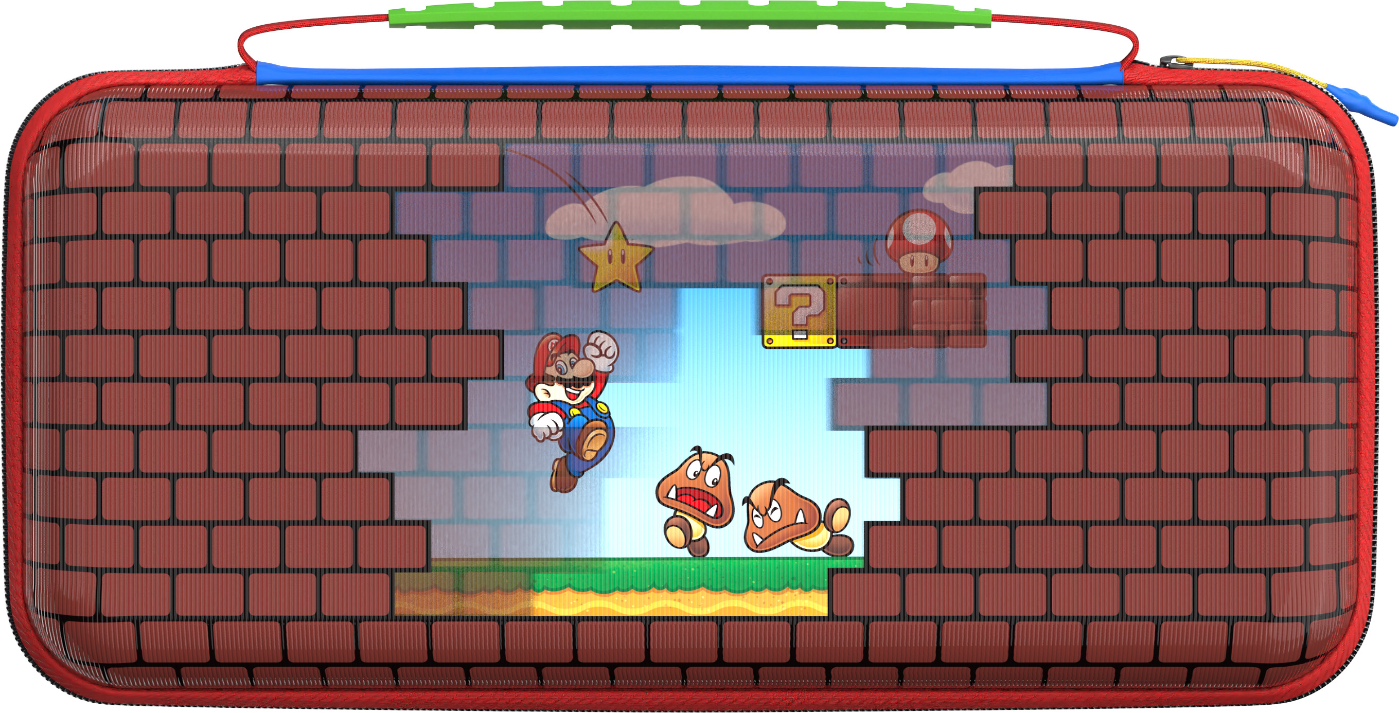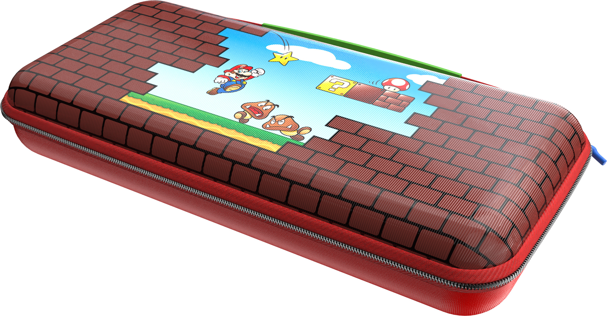Avec l'étui de voyage PlayTrek™ sous licence officielle pour Nintendo Switch™ 2, tu peux voyager en toute confiance. Cette édition Mario Bricks présente un design lenticulaire sympa qui affiche des scènes animées lorsque tu bouges l'étui. Également compatible avec la Nintendo Switch™ et la Nintendo Switch™ - modèle OLED, cet étui robuste est doté d'une coque moulée en EVA très résistante et d'une face extérieure en polyester recouverte de TPU pour une protection supplémentaire. Le rabat rembourré protège ton écran et sert également de support pour les cartes de jeu, tandis qu'une poche en filet permet de ranger les accessoires de manière ordonnée. L'étui est très pratique à emporter et dispose d'une poignée de transport confortable pour que tu puisses jouer en déplacement.