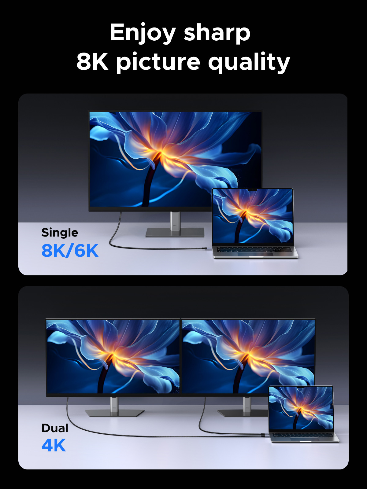 - Prend en charge la sortie vidéo UHD 8K 60 Hz : ce câble USB-C 240 W prend en charge la transmission vidéo avec une résolution vidéo allant jusqu'à 8K à 60 Hz. Que vous montiez des films HDR, réalisiez des dessins de haute précision ou regardiez des vidéos immersives, les détails sont clairement visibles.