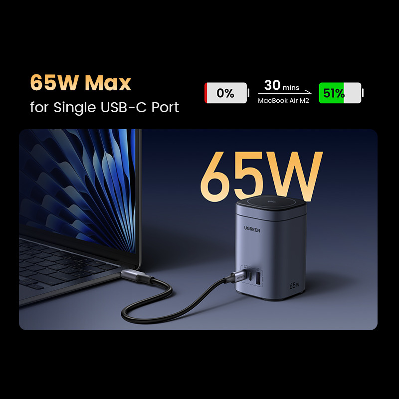 - Chargement puissant de 65 W par câble pour les ordinateurs portables : le port USB-C1 fournit une charge rapide PD complète de 65 W et permet de charger un MacBook Air ou Pro de 0 % à 51 % en seulement 30 minutes.