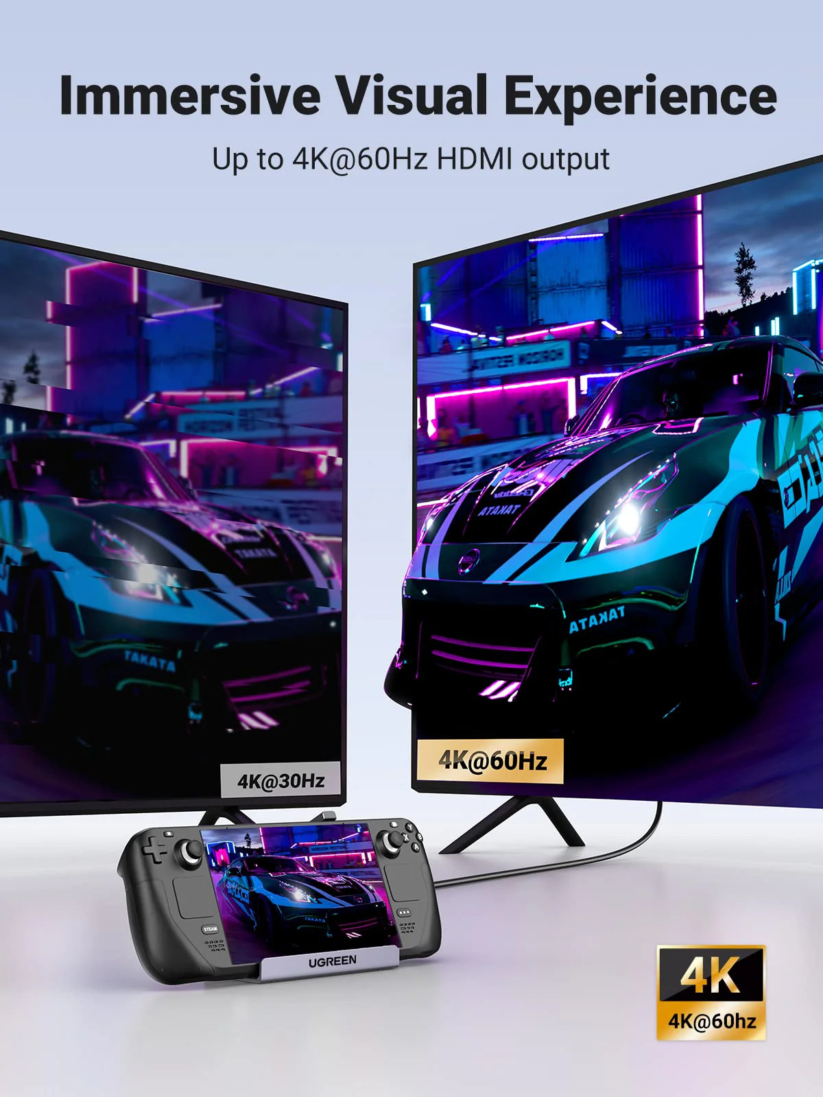 Sortie HDMI 4K@60Hz : la station d'accueil UGREEN Steam Deck dispose d'un port HDMI 4K@60Hz et prend également en charge 2K@144Hz et 1080p@240Hz. Vous pouvez ainsi connecter la plupart des écrans avec différentes résolutions et taux de rafraîchissement à votre Steam Deck et profiter d'une expérience de jeu fluide et de haute qualité.