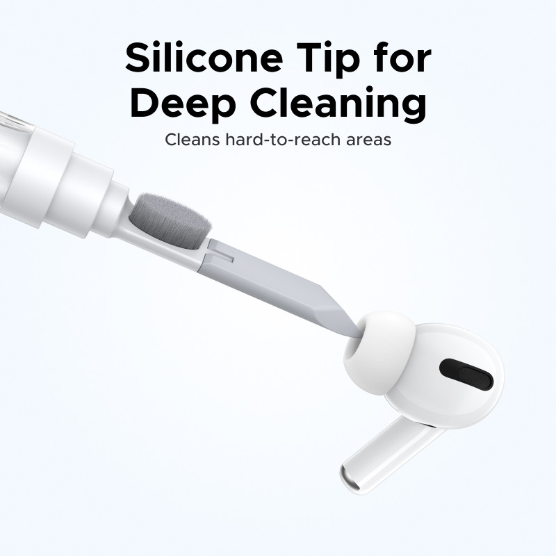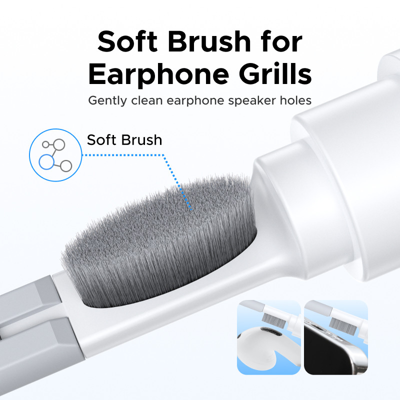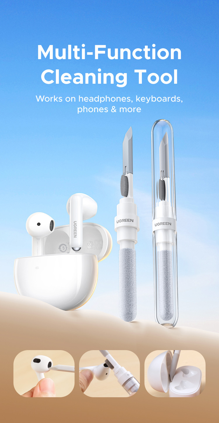 Le nettoyeur d'écouteurs UGREEN est un outil de nettoyage compact 3 en 1 qui maintient les écouteurs, les casques et leurs boîtiers de chargement hygiéniquement propres. Son boîtier en forme de stylo abrite trois composants de nettoyage spéciaux : une fine pointe en silicone pour enlever la saleté des petites fentes et des grilles de haut-parleurs, une brosse en microfibre douce pour enlever la poussière et le cérumen et une éponge floquée pour nettoyer l'intérieur des étuis de chargement en douceur et sans rayer. Fabriqué en ABS et PC robustes, le nettoyeur est léger et maniable, ce qui le rend idéal pour une utilisation quotidienne ou en voyage. Grâce à son design polyvalent, il convient également au nettoyage d'autres petits appareils électroniques tels que les connecteurs de smartphones, les claviers et les composants d'appareils photo, offrant ainsi un moyen sûr et efficace de prendre soin des accessoires technologiques fragiles.