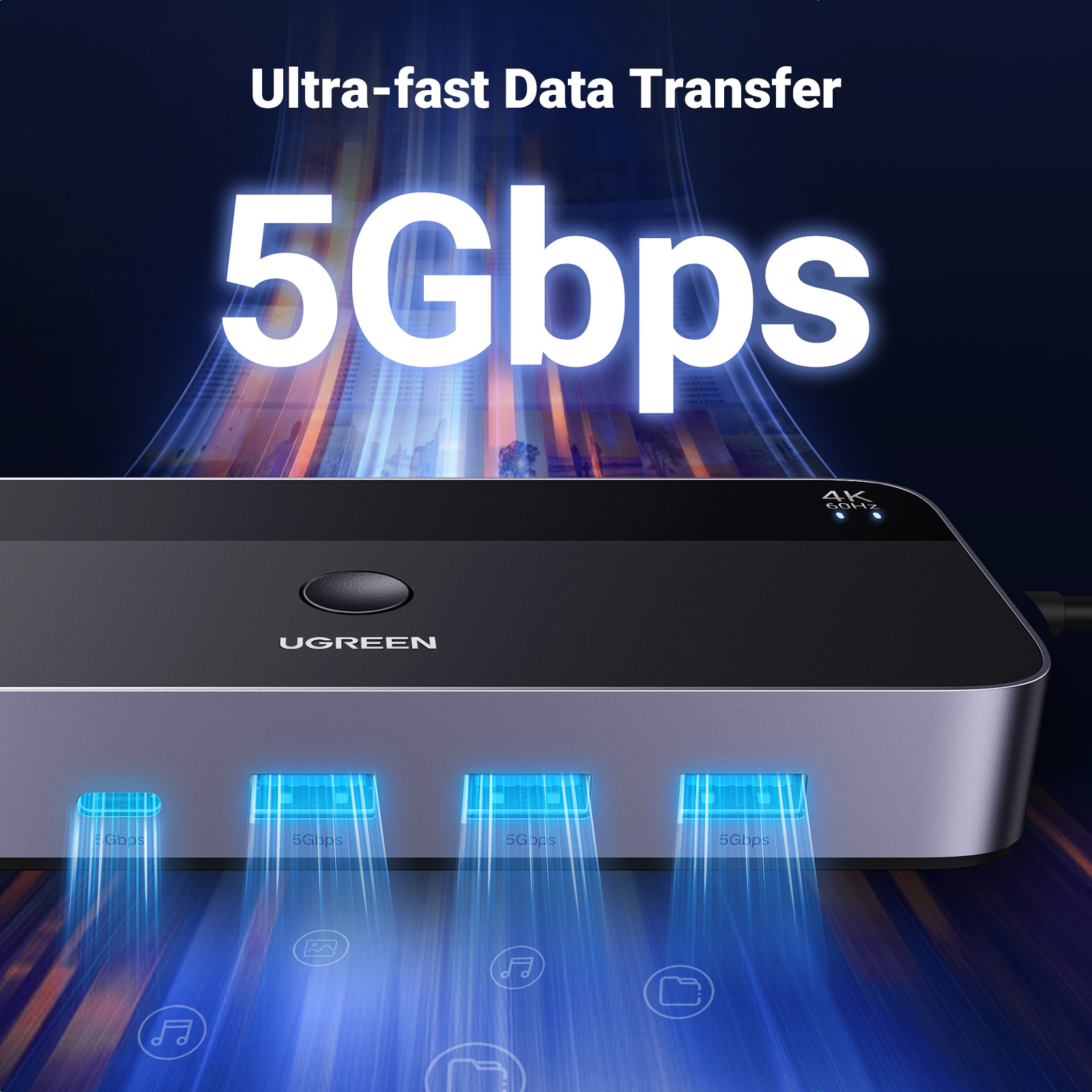 - Le commutateur UGREEN HDMI-KVM dispose de trois ports USB 3.0 et d'un port USB-C pour partager des clés USB, des imprimantes, des disques durs externes, des clés USB et d'autres appareils USB 2.0 et USB 3.0. L'USB 3.0 offre des vitesses de transfert de données allant jusqu'à 5 Gbit/s, tandis que l'USB 2.0 n'atteint que 480 Mbit/s. Cela permet un transfert plus rapide des fichiers et des images et rend le travail et la vie quotidienne plus simples et plus confortables.